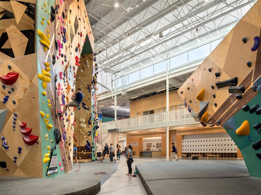 該設(shè)施擁有全面的配套設(shè)施,包括抱石區(qū)、符合國際標(biāo)準(zhǔn)的55英尺比賽攀巖墻、專門的兒童攀巖區(qū)、瑜伽和健身工作室、自由舉重區(qū)、零售空間和歡迎休息室。一個中央景觀庭院,由一個誘人的現(xiàn)場咖啡店固定,引入了郊區(qū)環(huán)境中不常見的行人友好的戶外空間,促進(jìn)社區(qū)互動,為游客提供一個充滿活力的社交環(huán)境。