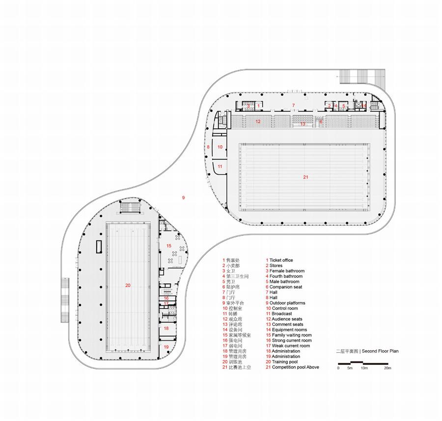 兩館之間的折角連接區(qū)域作為場館的交通核心,通過形體錯(cuò)動形成視覺與功能上的空間節(jié)點(diǎn)。觀眾主入口位于兩館之間,配合螺旋狀向內(nèi)收攏的屋頂構(gòu)造與挑空平臺,構(gòu)成整個(gè)游泳館最具儀式感的抵達(dá)場景。該空間既是觀演、等候、集散的節(jié)點(diǎn),也是城市公共生活的一部分,鼓勵(lì)市民在非消費(fèi)性空間中自由穿行、駐足、休憩,使建筑不止服務(wù)賽事,更回應(yīng)城市日常。