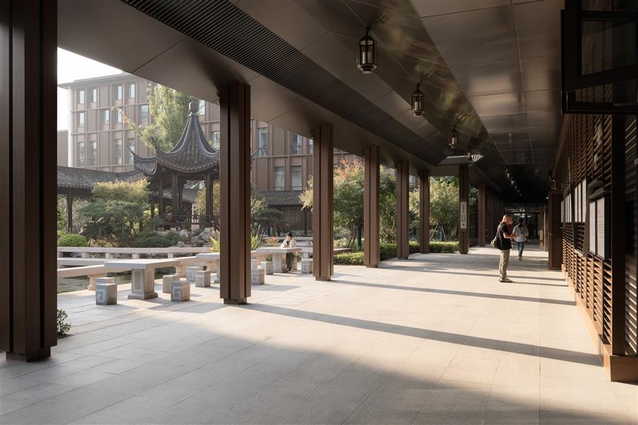 環(huán)繞中心的山水園,建筑挑檐貼水而設(shè),景觀游廊隨宜曲折,四時(shí)入景,人在園中走,如在畫中游。