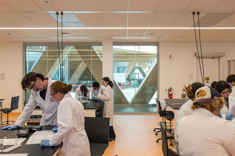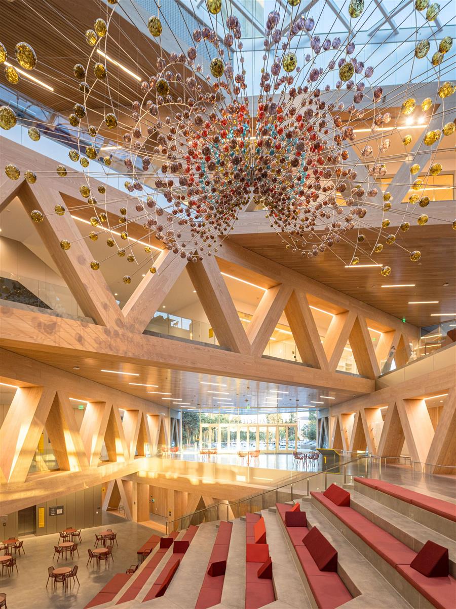The building's structure is designed as a stack of two volumes, with each pair rotated 45 degrees from the floor below. The voids of the rotated blocks create the full-height atrium at the heart of the building, which provides direct views into classrooms and research spaces from all levels. The open spaces within the atrium invite collaboration, embodying the center's architectural and educational approach. The facade incorporates board-formed panels of glass fiber reinforced concrete, which create a wood-like texture while providing the durability and fire resistance required for a modern laboratory. The roof's 11,000 sq ft of solar panels provide about 342 megawatt hours of energy production per year. Inside, each level bridges the level below, supported by triangular steel trusses clad in Douglas fir. The texture, rhythm, and geometry of the trusses carry through to the exterior, creating a seamless transition from inside to outside. The atrium features a large staircase meant for socializing and relaxing that connects the first two floors and a café, creating a lively hub in the center of the building. Suspended 30 ft in the air, Magnetic Field by Damien Ortega - an intricate sculpture of Earth's magnetosphere - floats in orbit, composed of 18 metal rings and 1,476 vibrant glass spheres.