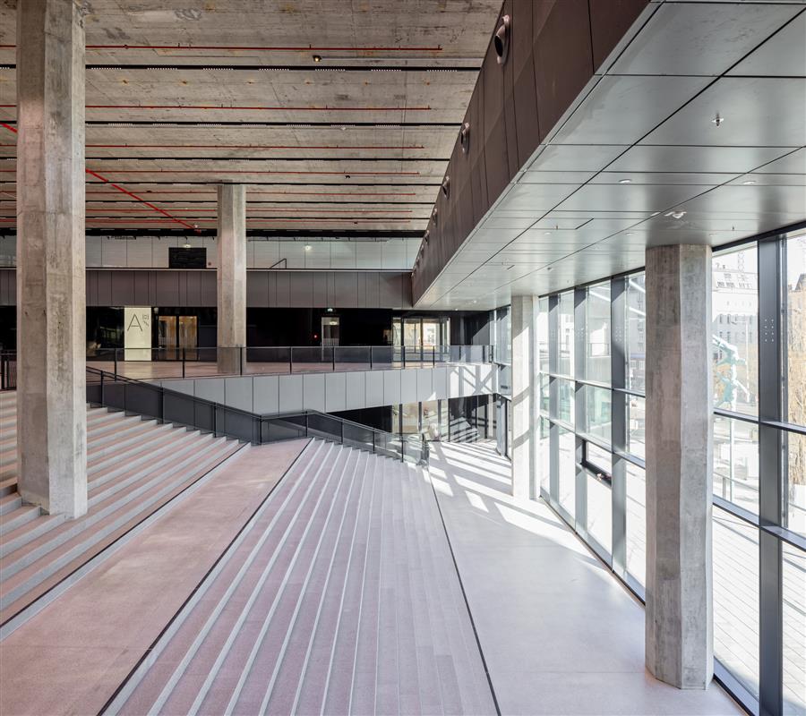 Study and analysis of the existing building — The new design was preceded by an extensive reading and understanding of the existing building from the 1970s. Using historical plans and documents, DMAA and JWA analyzed and internalized the initial ideas of the 900 architect, Karl Schwanzer to make a fundamental decision between demolition and conversion. With the help of BIM (Building Information Modeling), a digital twin of the existing building was created, which enabled comprehensive studies of the concrete cubature and the consequences of possible adaptations. The potential of the existing building with its economically optimized reinforced concrete structure, which was exceptional for the 1970s, was thoroughly examined in terms of statics, noise, and fire protection, as well as suitability in terms of building physics. Characteristics of the existing building in its function as the headquarters of Bank Austria were the mirrored fa?ade and a striking, expansive, but almost unused staircase. The mirrored fa?ade emphasized the hermetic nature of the building, while the monumental gesture of the external staircase dominated the area of Julius-Tandler-Platz. The remodeling allowed these outdated stylistic elements to be removed.