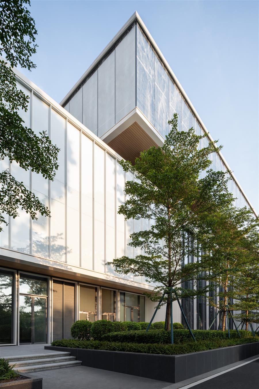 The facade design translates this diversity into a coherent whole: vertical frames, articulated horizontal slabs, and translucent glass respond to the interior programs, balancing openness and privacy. The transparent ground floor invites the public in; the floating middle volume, wrapped in frosted glass, accommodates community spaces; and the upper volume, defined by fritted glass panels, houses the theater and public lobby. Warm wooden finishes on terraces and soffit bring a tactile, human quality to the structure.