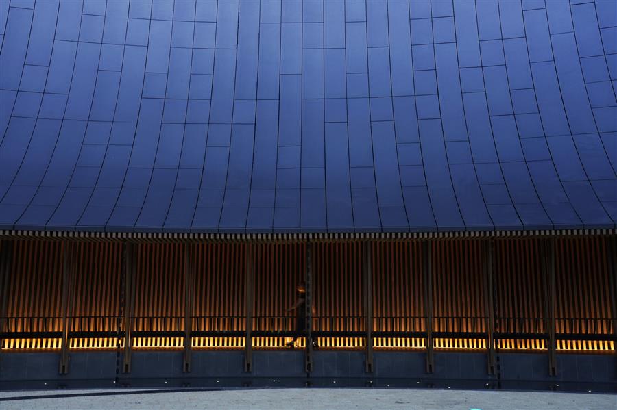 主要的挑戰(zhàn)是改造這個(gè)最初設(shè)計(jì)為酒店的超大建筑,以更好地適應(yīng)這個(gè)千年水鄉(xiāng)的規(guī)模和氛圍。設(shè)計(jì)不僅需要回應(yīng)文化象征,還需要結(jié)合觀眾流通、設(shè)備進(jìn)出等實(shí)際的表演后勤。我們沒(méi)有將建筑覆蓋在傳統(tǒng)的圖案中,而是引入了“窗簾”這個(gè)概念,這是一個(gè)視覺(jué)和隱喻都有效的概念。兩塊彎曲的、像窗簾一樣的鋁板輕輕地掩蓋了原來(lái)的形式,創(chuàng)造了一個(gè)明亮、開(kāi)放的印象。抬高的入口暗示著戲劇的期待,而后面的黑暗走廊形成了一個(gè)讓人想起中國(guó)傳統(tǒng)山墻屋頂?shù)募粲?,為現(xiàn)代干預(yù)提供了一個(gè)文化錨。