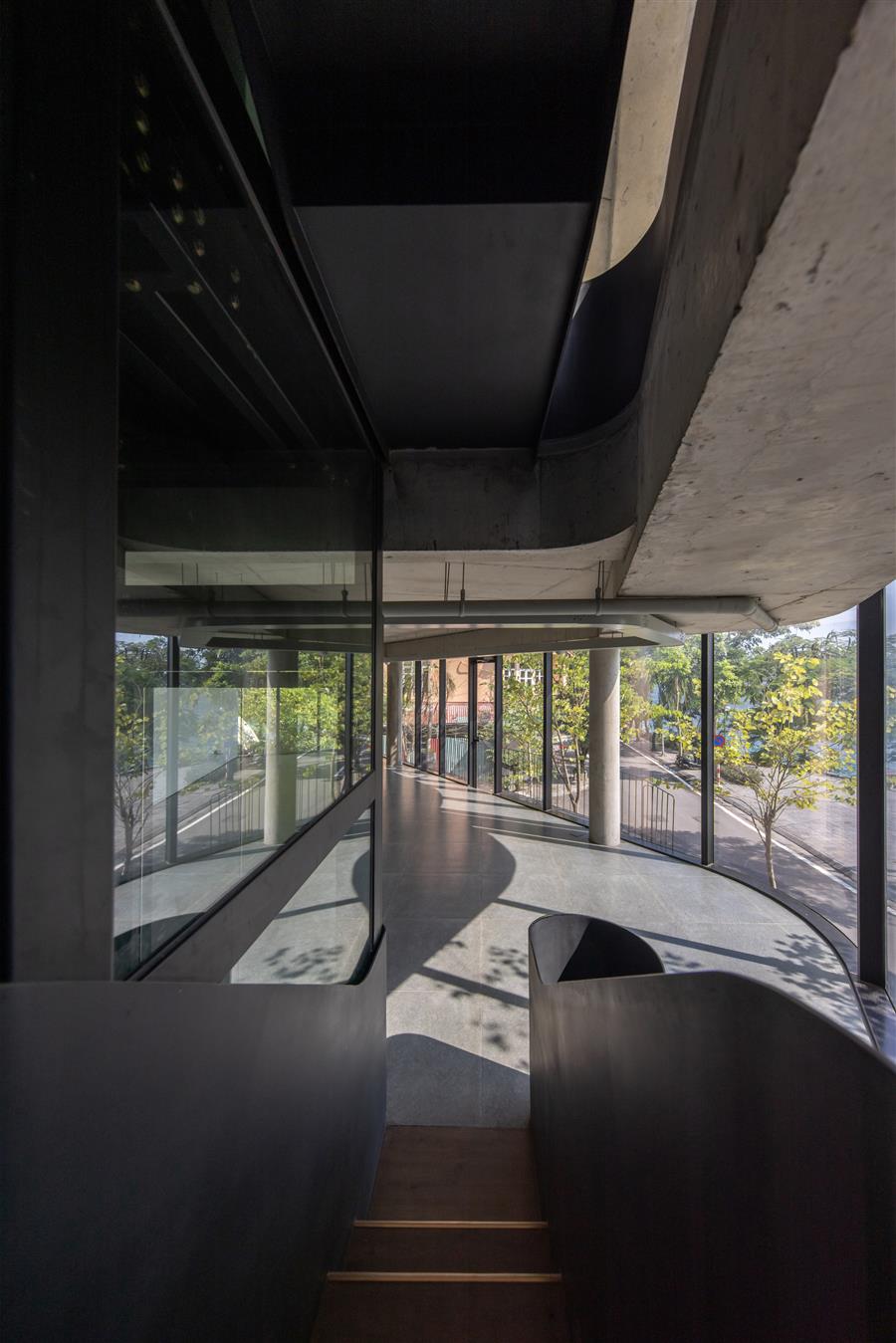 Natural light penetrates the interior throughout the day, while the shadows of trees and reflections of the water animate the floors and ceilings, blurring the boundary between inside and outside.At ground level, a soft transition space is created through a wooden terrace, greenery, and a setback from the public walkway. This creates an inviting threshold where pedestrians can pause, observe, or interact with the activities inside.