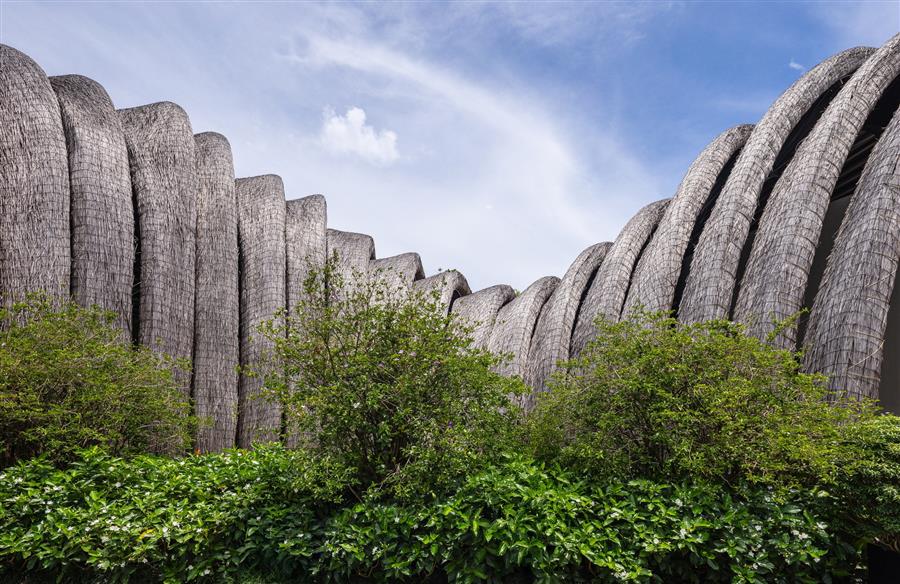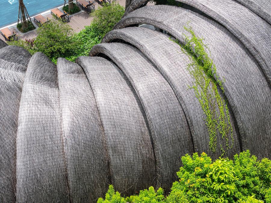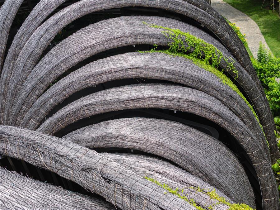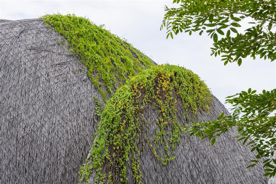 1.Gu?t屋頂-有機(jī)表皮:屋頂覆蓋的不是工業(yè)材料,而是Gleicheniaceae (gu?t),一種手工制作的天然材料。這種天然的表皮不僅提供了覆蓋物,還充當(dāng)了小氣候過(guò)濾器,保持下面的空間涼爽,并提供獨(dú)特的觸覺(jué)質(zhì)量。隨著時(shí)間的推移,gu?t屋頂將改變其色調(diào),進(jìn)一步融入附著在其上的茂密綠色植被層。