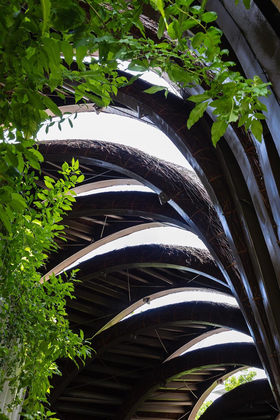 1.Gu?t Roof – The Organic Skin: Instead of industrial materials, the roof is covered with Gleicheniaceae (gu?t), a handcrafted, natural material. This natural skin not only provides covering but also acts as a microclimate filter, keeping the space below cool and offering a unique tactile quality. Over time, the gu?t roof will change its hue, further blending into the layer of lush green vegetation clinging to it.