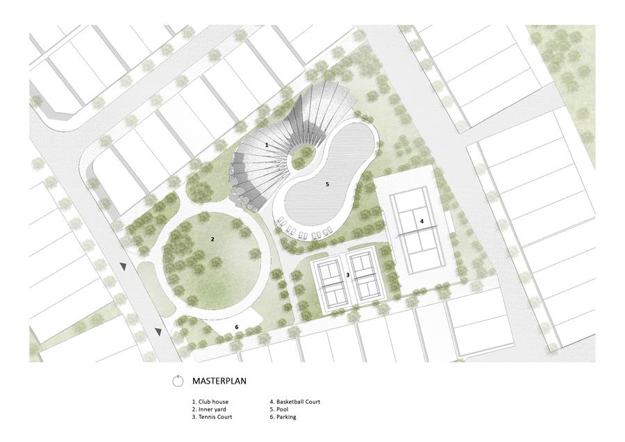 形式流動(dòng):從山到圓頂——受大自然雄偉輪廓和林河地域文化的啟發(fā),建筑師創(chuàng)造了一個(gè)非線(xiàn)性的建筑體量,挑戰(zhàn)了城市環(huán)境的棱角。這個(gè)8米高的建筑不是一個(gè)標(biāo)準(zhǔn)的會(huì)所,而是一個(gè)巨大的貝殼,或者是一個(gè)圍繞游泳池盤(pán)旋的建筑流。