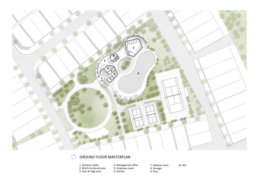 空間和功能:社區(qū)建筑- Gu?t花園住宅是一個(gè)“一體化”的舒適綜合體模型,旨在服務(wù)于居民的度假生活方式。總建筑面積530平方米,該設(shè)施包括以下核心功能: