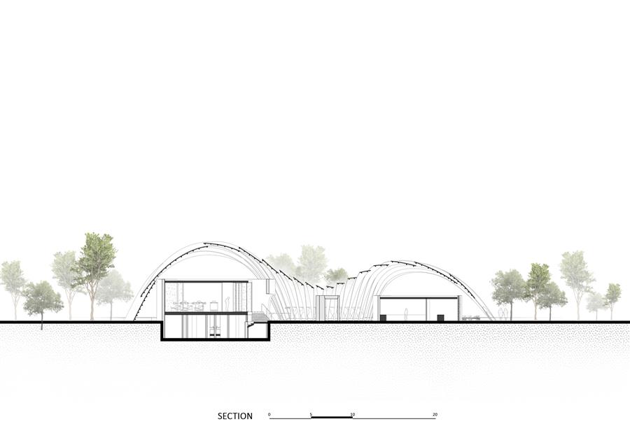 屋頂結(jié)構(gòu)是一個(gè)標(biāo)志性的亮點(diǎn),由優(yōu)雅彎曲的白漆鋼桁架系統(tǒng)形成。屋頂?shù)拿總€(gè)褶皺不僅是承重元素,也是自然光和通風(fēng)的開(kāi)口,模擬山上的時(shí)間折痕,在天空和地面之間創(chuàng)造柔和的視覺(jué)過(guò)渡??倛?chǎng)地面積為5380平方米,但建筑密度僅為9.8%,俱樂(lè)部會(huì)所是比例適度和絕對(duì)優(yōu)先考慮景觀的典范。