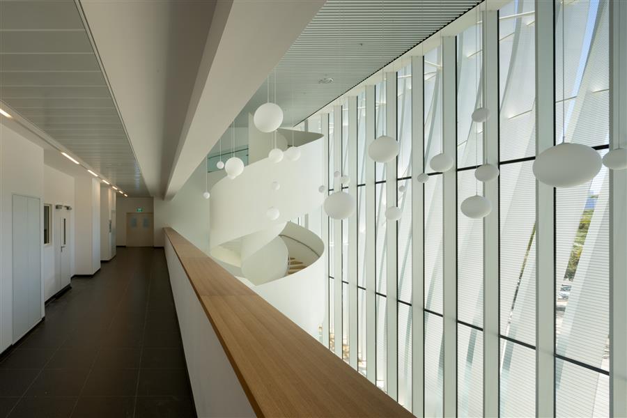 Around this central core is a large circulation ring bathed in daylight. A space where research scientists can exchange and meet. An elegant sculptural white spiral staircase rising from the lobby conceals the elevators behind. It invites you to wander, symbolizing walking as the driving force behind scientific discovery.