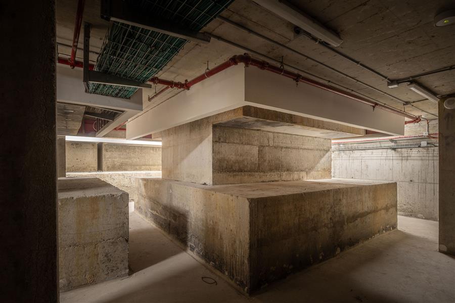 為了消除外部的振動(dòng),9個(gè)巨大的混凝土塊被澆筑在現(xiàn)場(chǎng),錨定在堅(jiān)實(shí)的地基上。這些塊可以配備液壓系統(tǒng),使振動(dòng)完全吸收,使振動(dòng)難以察覺。這種裝置強(qiáng)調(diào)了一種提供完美穩(wěn)定基礎(chǔ)的建筑設(shè)計(jì)。它構(gòu)成了“第六面”。