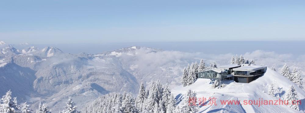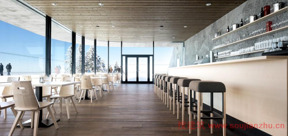 該項目是由Markus Innauer, Bernd Frick設(shè)計的。建筑形狀、方向、內(nèi)部結(jié)構(gòu)清晰而大膽的設(shè)計開發(fā)了全景餐廳現(xiàn)有的地形。整個建筑靠著山坡的山脊。外部樓梯道屋頂露臺是繼原有的地形并且把建筑分成兩部分。 到不同的方向一覽無余顯示的序列空間的開放性,有內(nèi)部和外部之間的平滑過渡。餐廳地板的特點(diǎn)是寬的水平玻璃面上面畫有大自然的元素。該建筑的外觀是混凝土和玻璃組成的,而室內(nèi)采用的主要是當(dāng)?shù)氐哪静?。相比之下,黑色的木材用在飯店的地板和天花板上,所有的?dú)立的區(qū)域和全部餐廳設(shè)施都是淡棕色的。