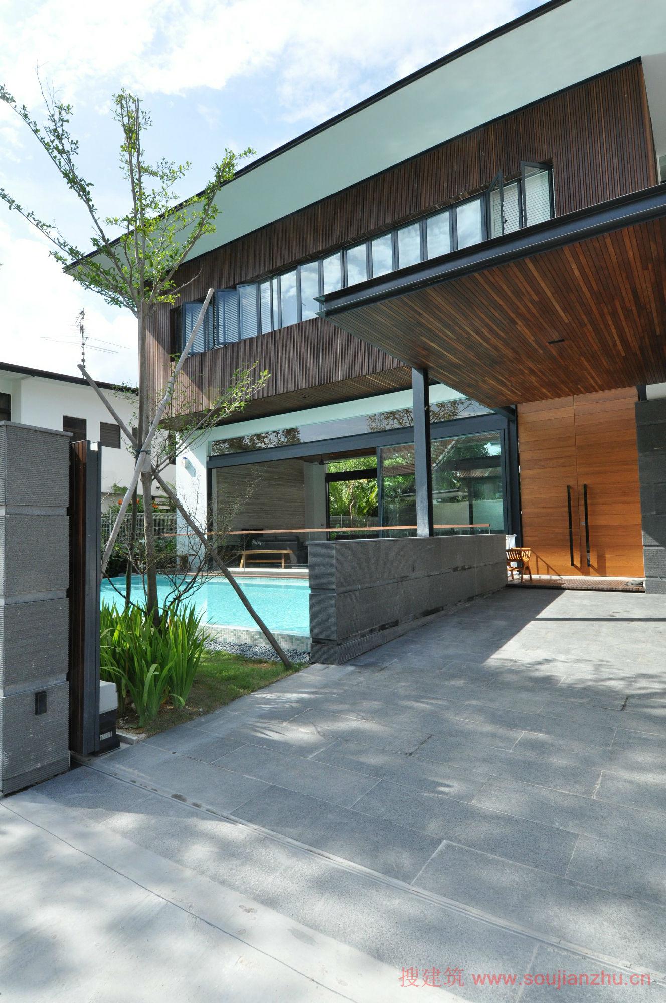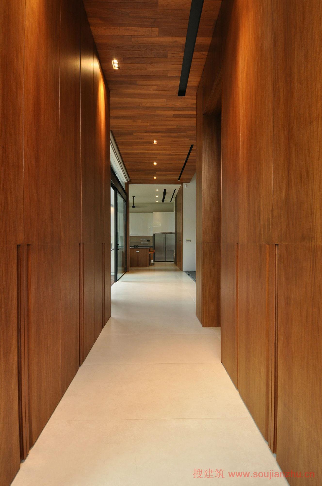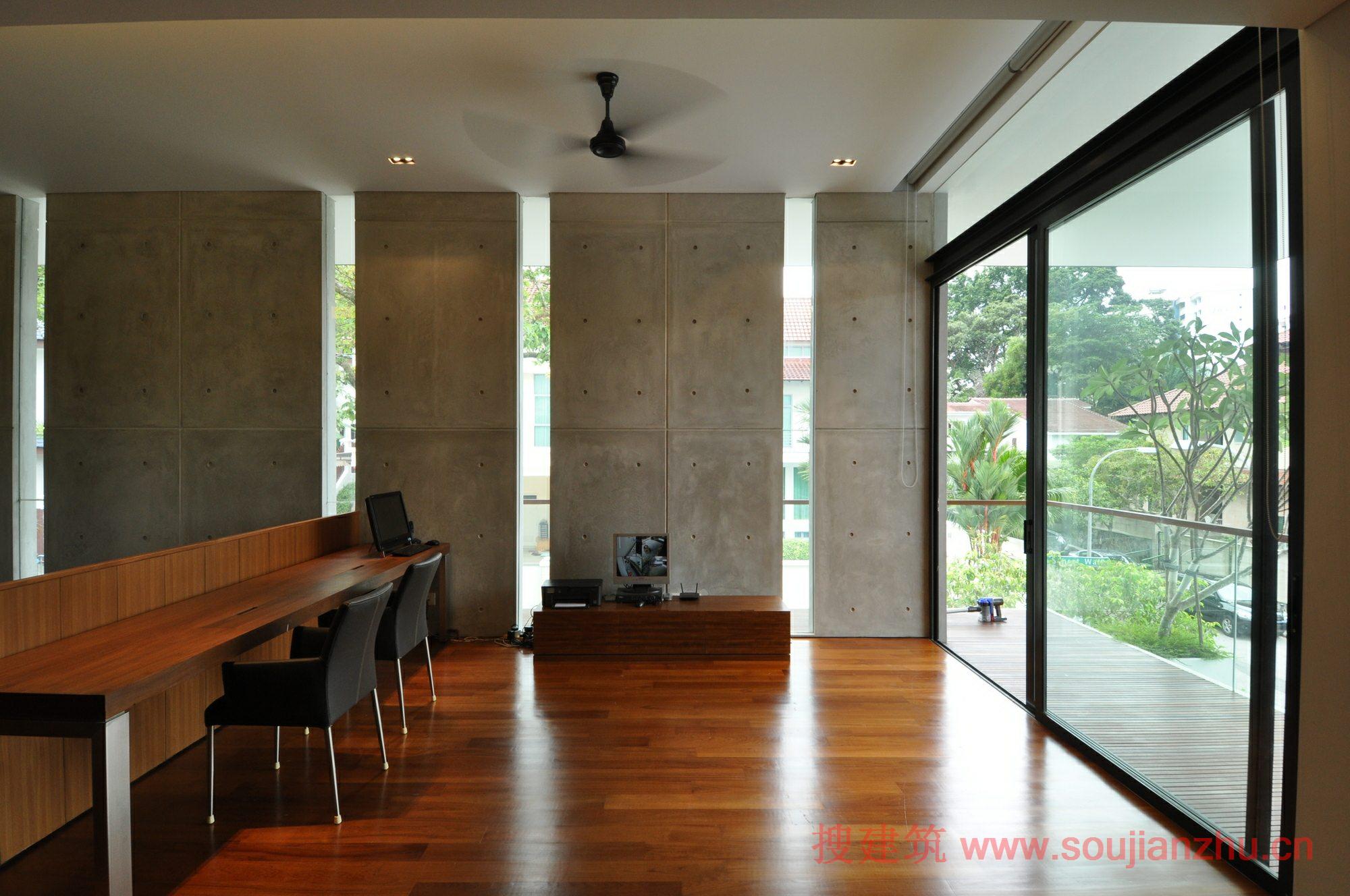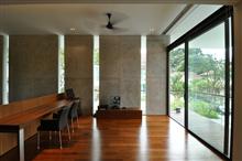 合并起居室和餐廳形成一個開放性的展館空間經(jīng)驗,一邊是自然水域一邊是綠色景觀。高3.6米柚木木材天花板,允許的最大光進入生活空間和良好的自然通風(fēng),當(dāng)所有的滑動玻璃門都打開的時候。作為一個結(jié)果,房屋內(nèi)部充滿了光明和空氣,使熱帶氣候的新加坡有一個舒適的生活經(jīng)驗。雨水通過大型懸垂鋁制屋頂收集到海灣,屋頂同時也提供了充足的陰影。