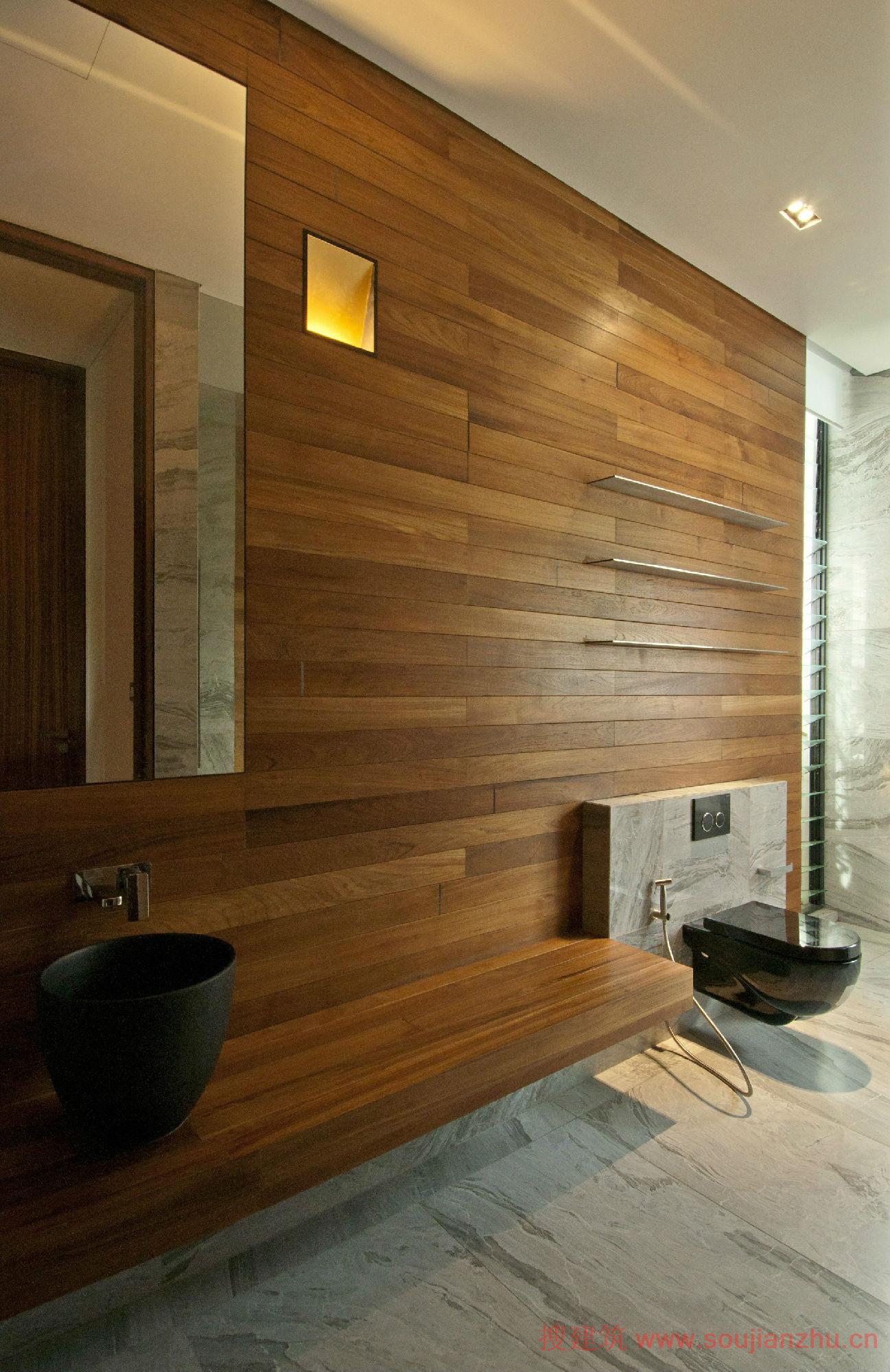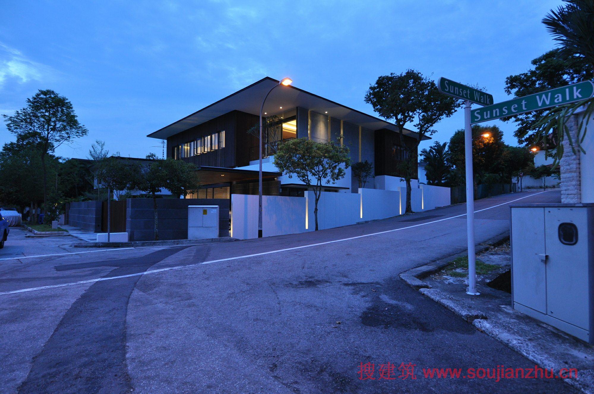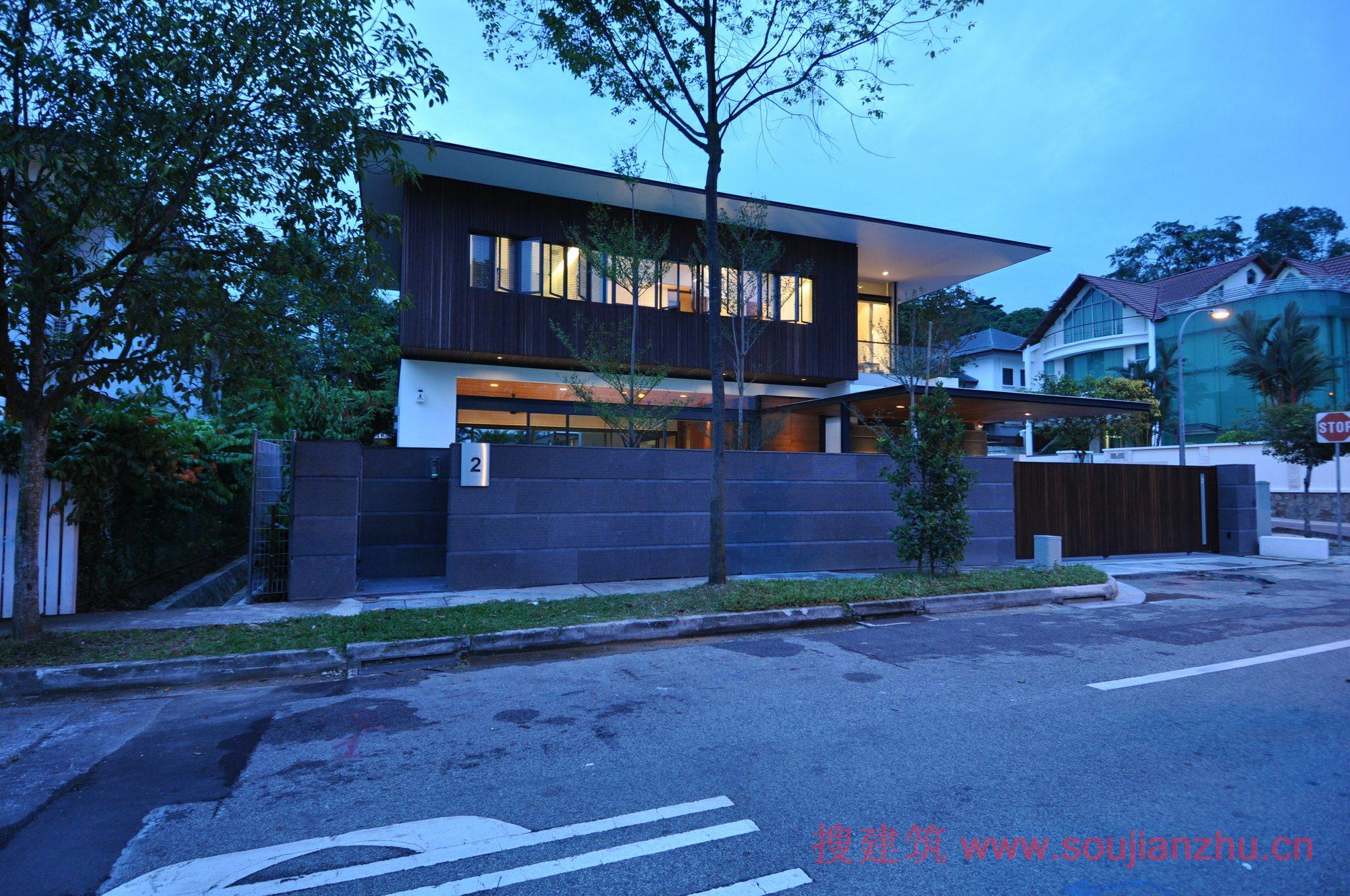合并起居室和餐廳形成一個開放性的展館空間經(jīng)驗,一邊是自然水域一邊是綠色景觀。高3.6米柚木木材天花板,允許的最大光進入生活空間和良好的自然通風(fēng),當(dāng)所有的滑動玻璃門都打開的時候。作為一個結(jié)果,房屋內(nèi)部充滿了光明和空氣,使熱帶氣候的新加坡有一個舒適的生活經(jīng)驗。雨水通過大型懸垂鋁制屋頂收集到海灣,屋頂同時也提供了充足的陰影。