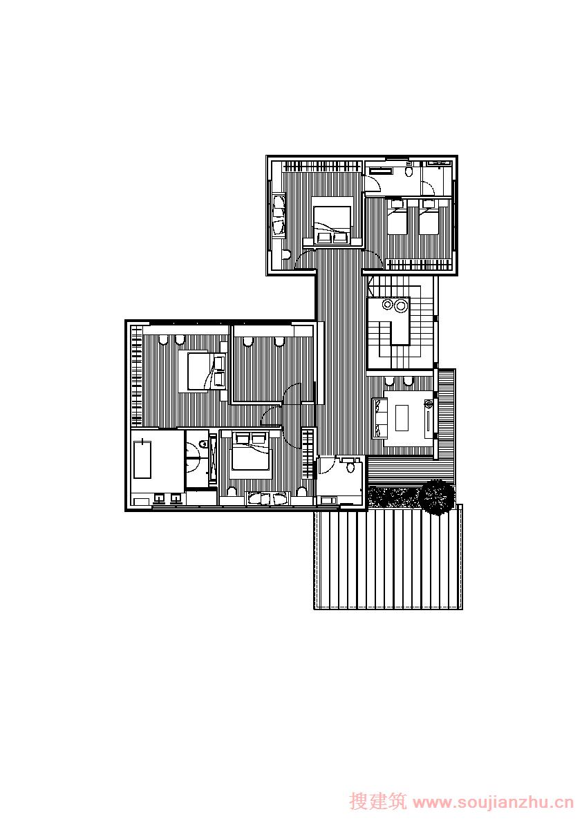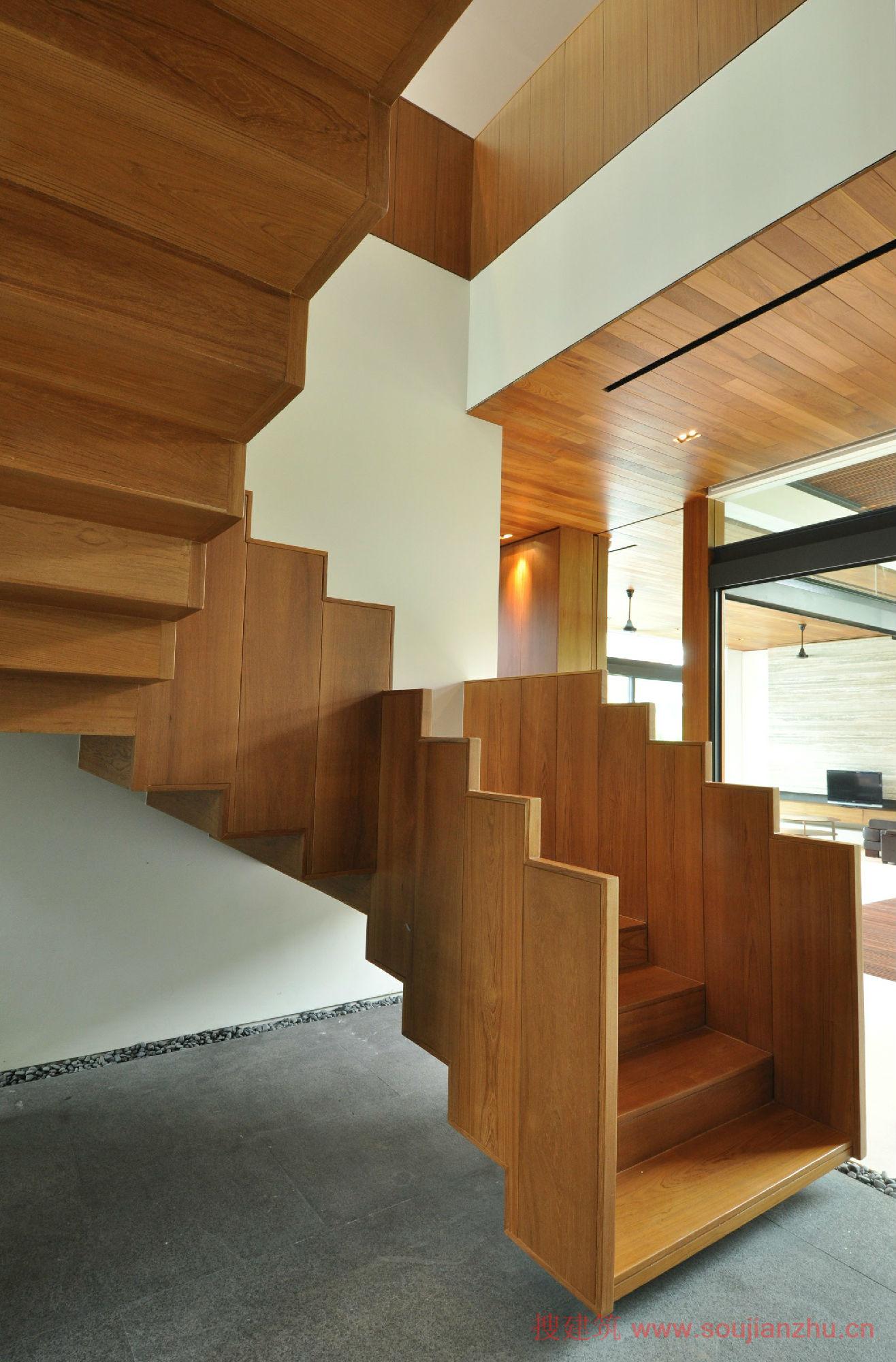一個完全浮動功能的樓梯將兩個樓層連接在一起,成為雙高度的空間,內(nèi)襯8米高的混凝土墻。 Borneo Ironwood木材利用來隔離臥室,以及打破建筑質(zhì)量的第二層建筑物外墻。在業(yè)主的要求下,木材未經(jīng)過處理以經(jīng)的得起自然天氣變化,創(chuàng)造一個個人的、誘人特性的住宅。