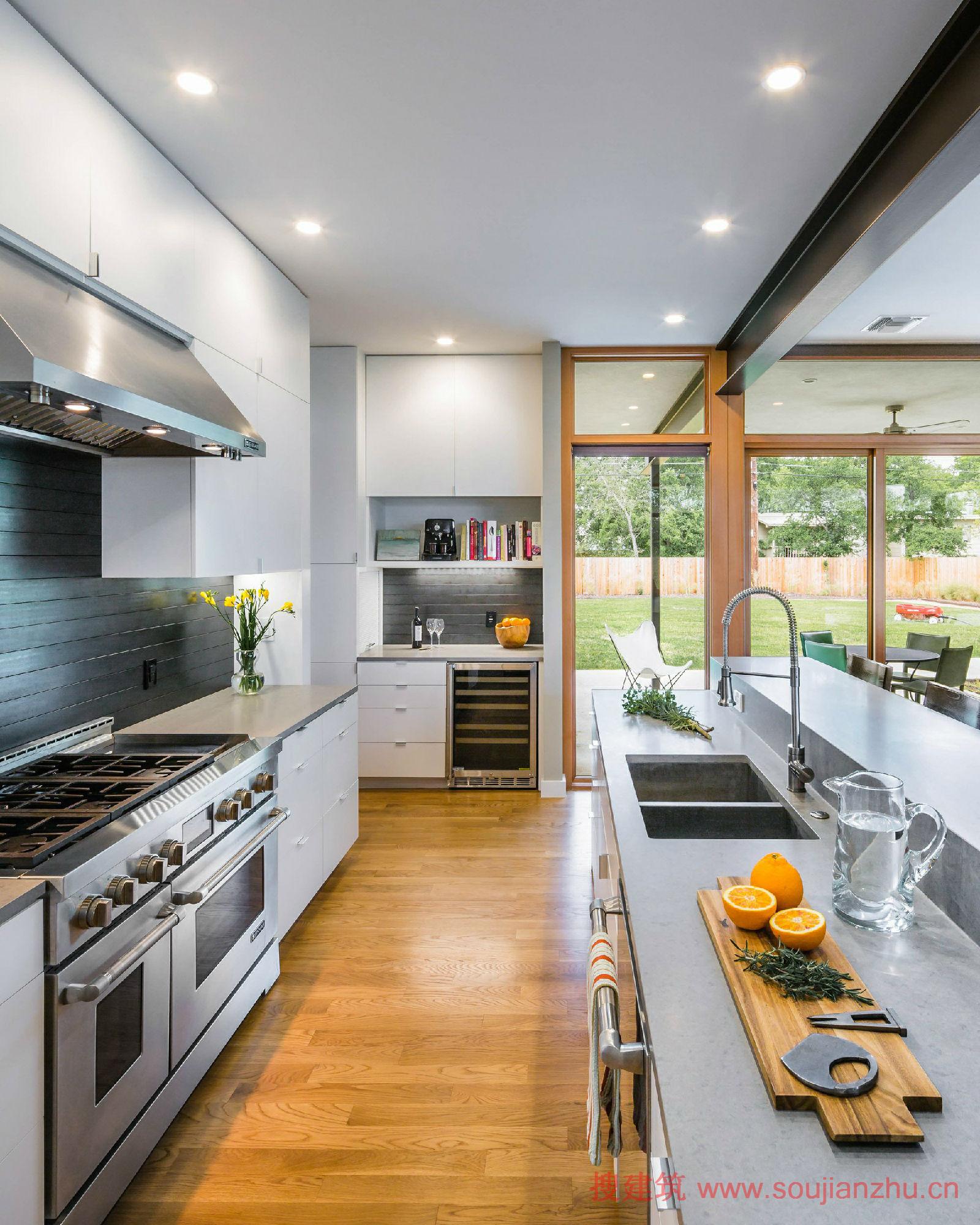 該項(xiàng)目是由A Parallel Architecture設(shè)計(jì)的,Paramount住宅位于南奧斯丁山頂邊,是城區(qū)內(nèi)的最高點(diǎn)之一,享有美麗的城市天際線和山地鄉(xiāng)村風(fēng)景。由于住宅所在地形陡峭,建筑局部埋入地下,機(jī)動車通道和停車位布置在下層,而生活空間及大懸挑屋頂平臺布置在上層。錯層的設(shè)計(jì)既符合當(dāng)?shù)爻鞘幸?guī)定,又最大化擴(kuò)展視線、保護(hù)底層沿街面的隱私性。