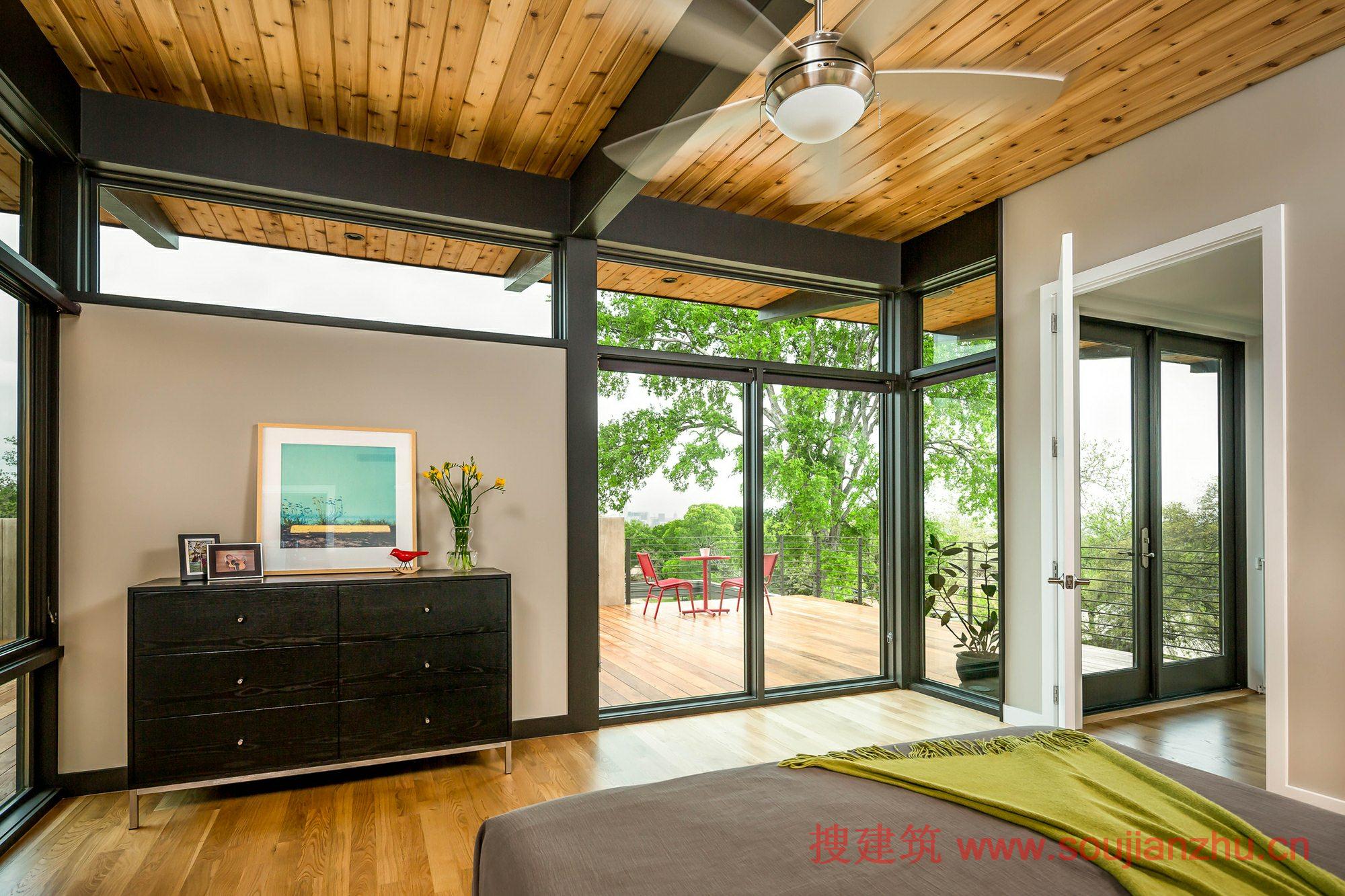 這種構(gòu)造設(shè)計(jì)強(qiáng)化了垂直列,開始于沉重的混凝土基座,保留地面在下沉的車庫并并成為基礎(chǔ),暴露的鋼,支撐第二層和重型載荷梁和屋頂甲板,懸臂式和膠合木梁在高頂,往上逐漸變細(xì)成錐形。建在屋頂種植園主屏幕不相鄰的景觀而提供了隱私的主人套房。室外樓梯連接屋頂甲板和私人后院,在一個(gè)慷慨的陰影覆蓋門廊面臨窗墻西和提供一個(gè)戶外的客廳。