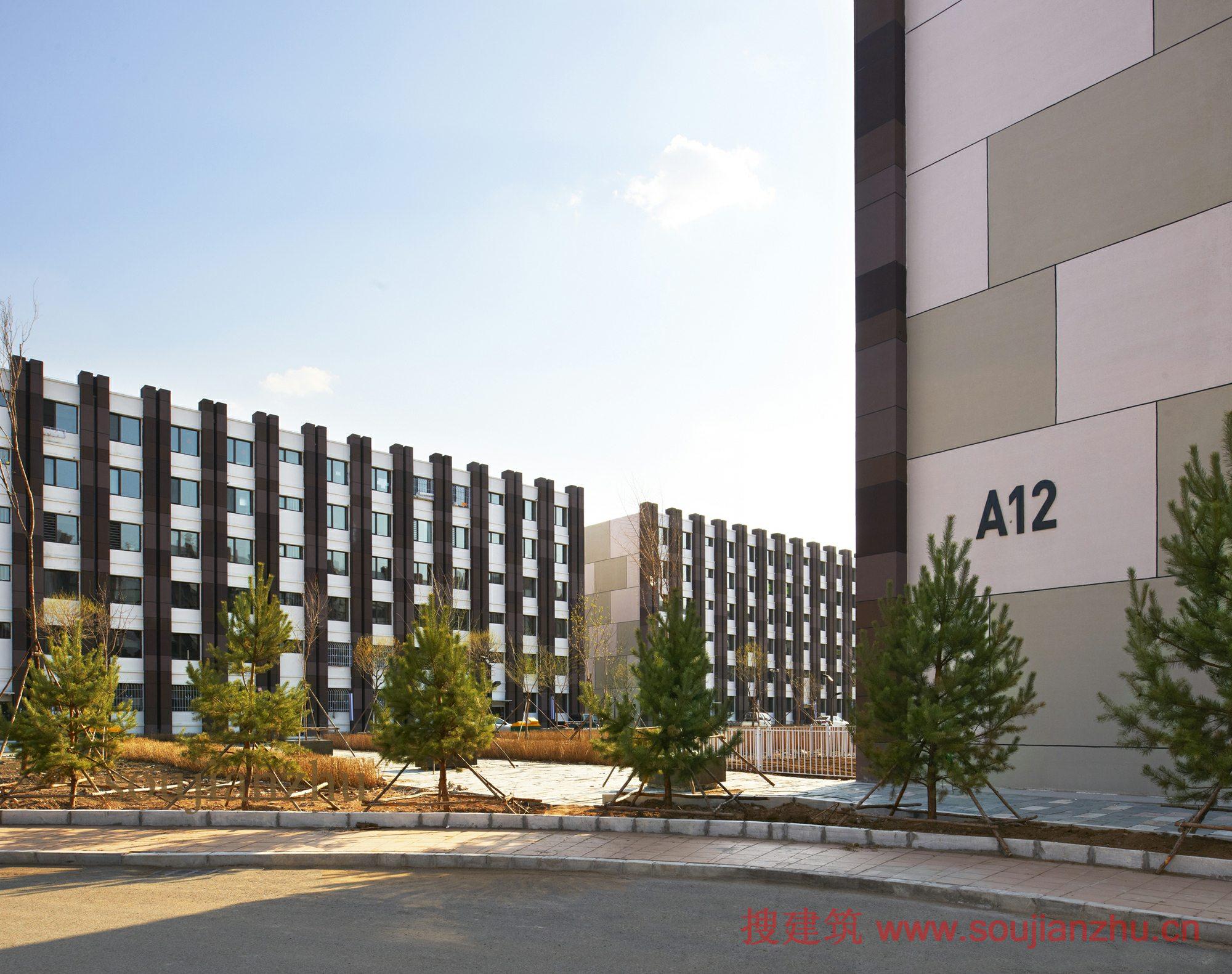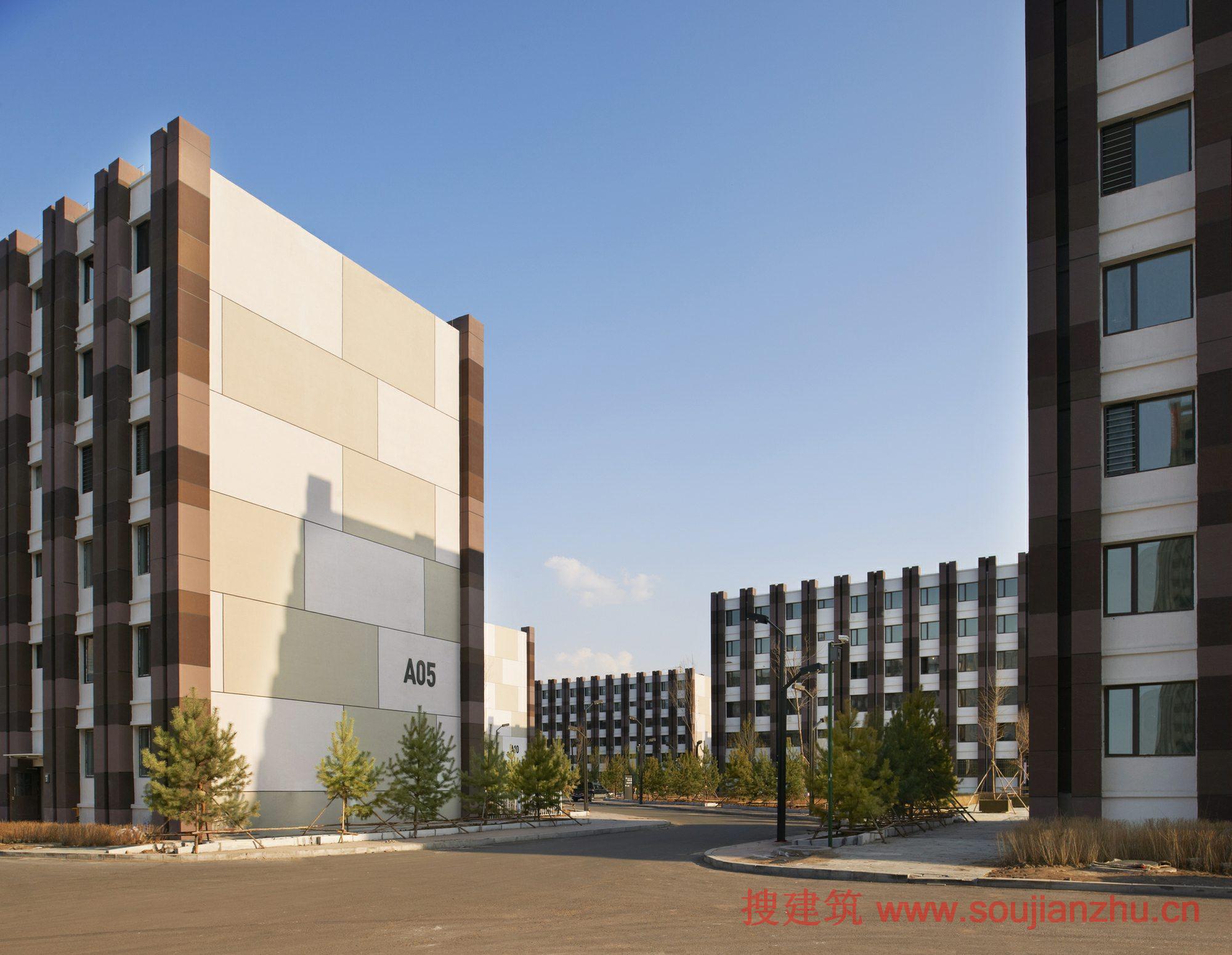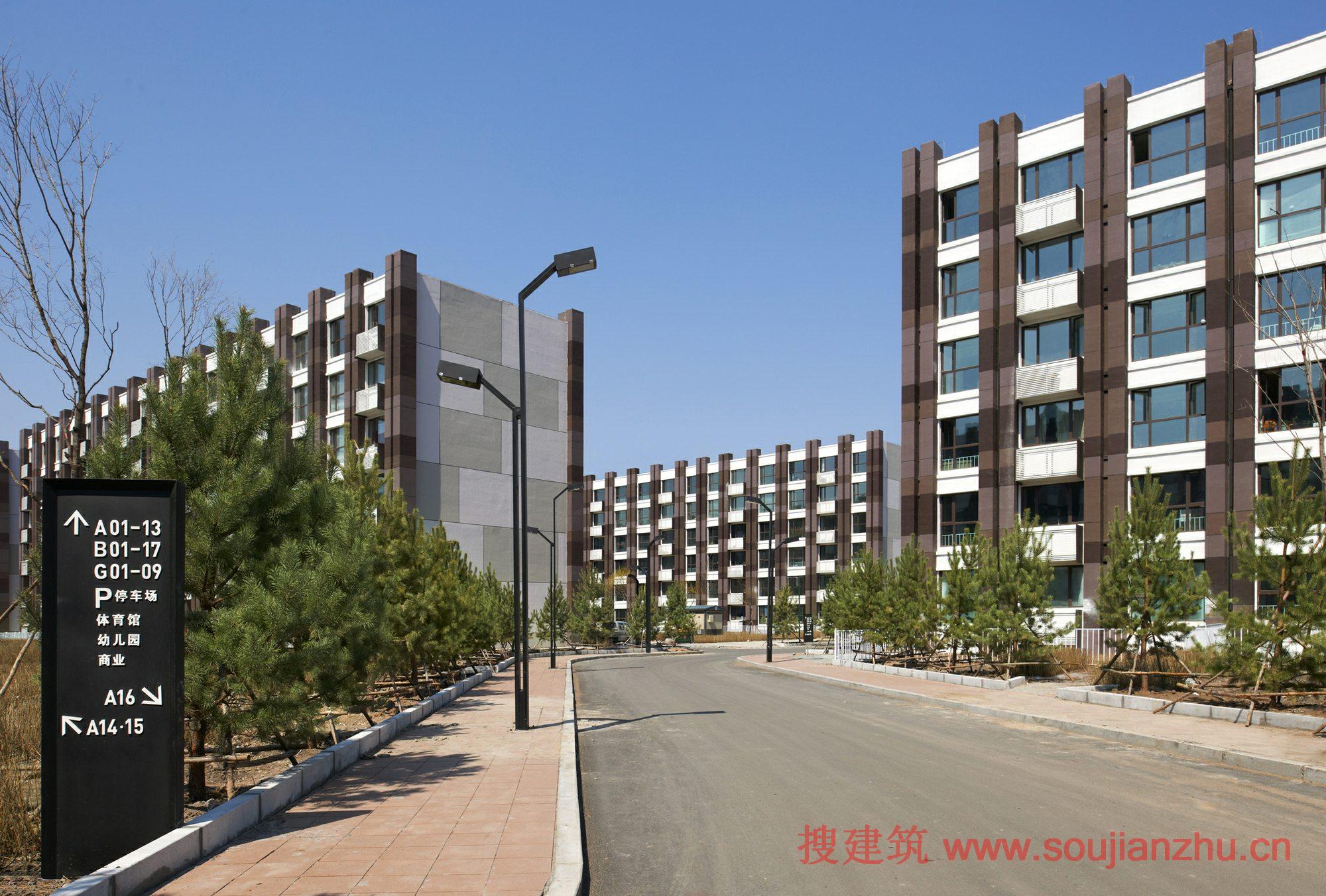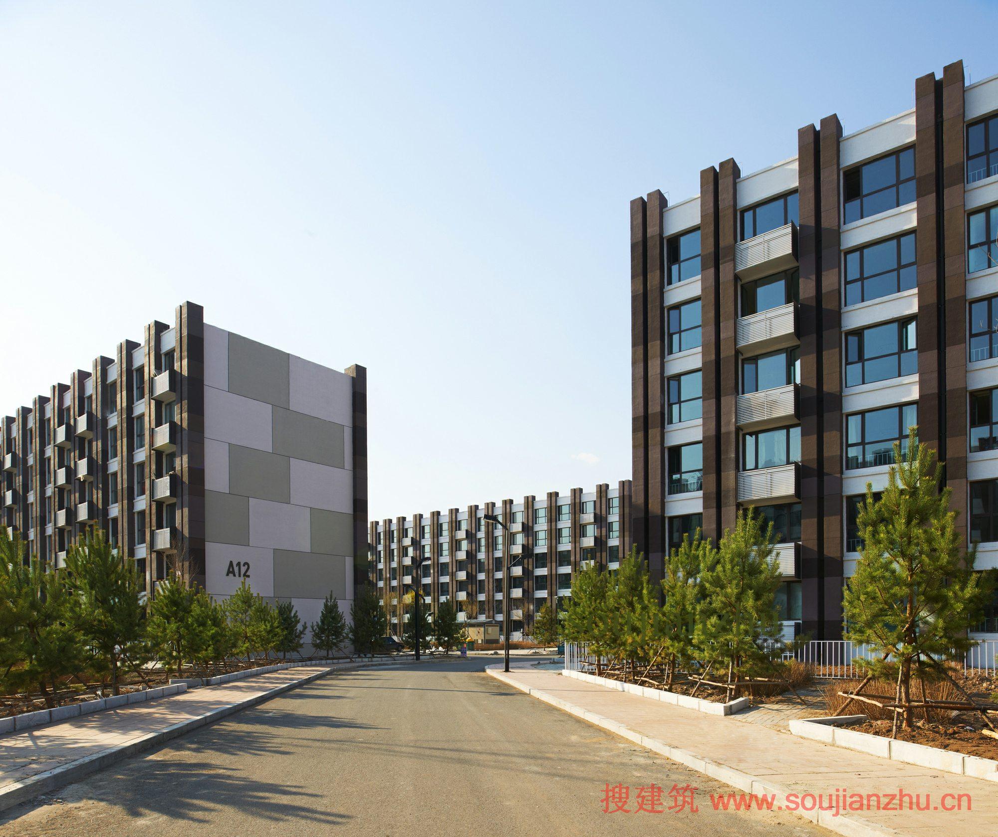 總體布局:半獨(dú)立式別墅位于地塊東南部,而中間的6層住宅,在西北角。讓盡可能多的居民都能夠享受到戶外自然光的照耀,同時(shí)又能夠觀賞到沿黎明河而建的開放的水上景觀。該建筑在南北布局的缺點(diǎn)是,來自東西方向寒冷的空氣和冬季陣風(fēng)會(huì)透過窗戶上的玻璃表面帶走室內(nèi)熱量。為了盡可能的不讓房屋內(nèi)的熱量散失以給住宅樓房屋更有效的保溫,建筑師們想了一個(gè)辦法,在住宅樓的外墻設(shè)計(jì)建造了一個(gè)至上而下垂直于外墻并向外突出550毫米寬的立式圓筒形構(gòu)造。提高了冬季北方供暖的效果。同時(shí)從建筑美學(xué)方面來看,高層住宅樓外墻分別被刷上紅色等暖色調(diào),三種顏色和優(yōu)雅的白色進(jìn)行合理的搭配,形成了大慶市非常獨(dú)特的城市景觀。