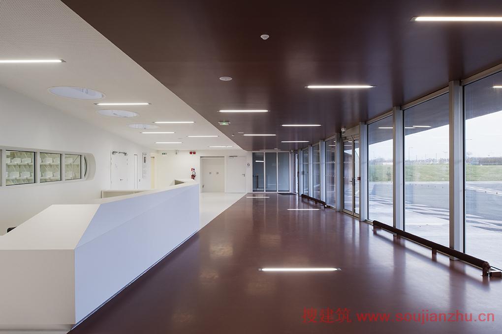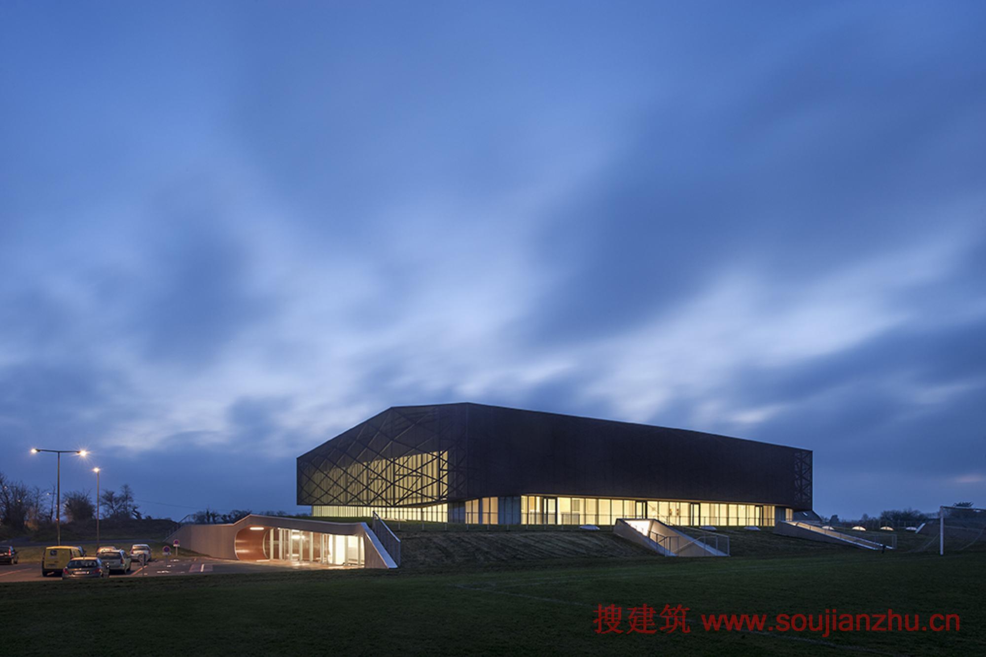 該項(xiàng)目是由Bohuon Bertic Architectes設(shè)計(jì)的,其周邊位置設(shè)有一個(gè)足球場(chǎng)。體育館視野開(kāi)闊,環(huán)境很好,可以欣賞周?chē)淖匀痪坝^。建造時(shí),該項(xiàng)目遵循兩大原則:夾層樓面設(shè)計(jì)和信號(hào)傳送要求。夾層樓面包括所有的輔助空間,南北走向,設(shè)計(jì)了草坪和綠地,東邊是公共大廳,與停車(chē)場(chǎng)相連,西邊是技術(shù)區(qū)和儲(chǔ)藏室。