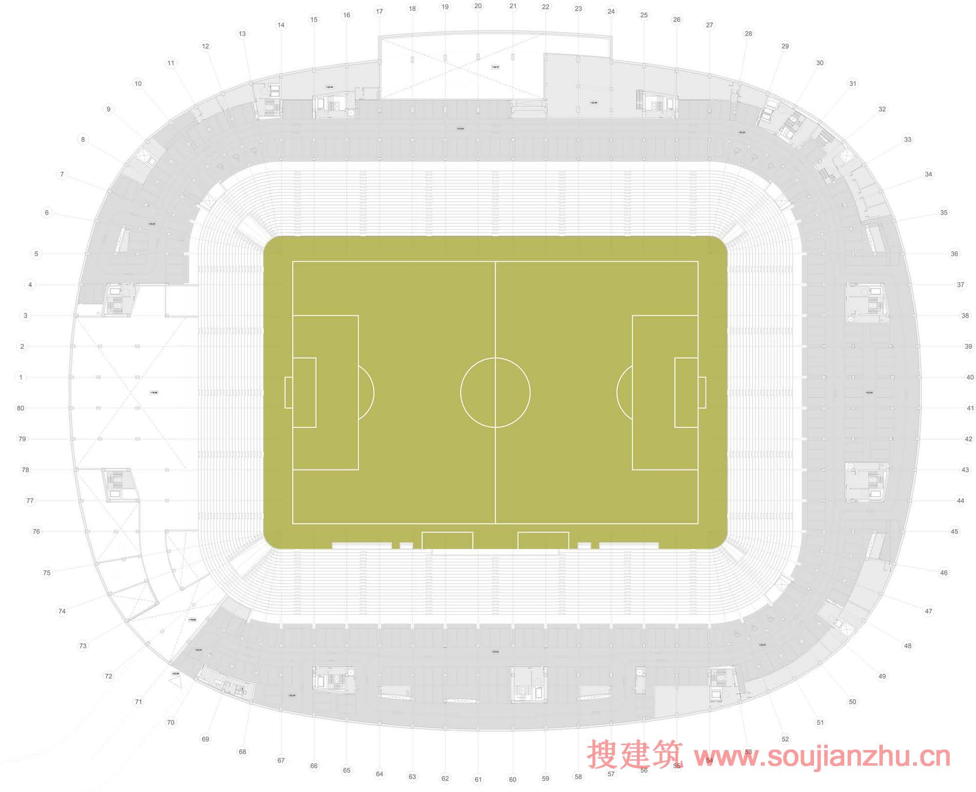 新體育場的位置,在畢爾巴鄂城市網(wǎng)的擴(kuò)張區(qū),窺視著特權(quán)的口,使建筑成為一件建筑作品,與此同時(shí),尊重該地區(qū)城市的其它建筑物。銘記第一方面的設(shè)計(jì),即感知豎立建設(shè)作為城市建筑的看法,與他人并不僅僅是簡單的體育設(shè)施。它的目的是把那些一文不值的體育場變得有價(jià)值。位于體育場的周邊和后部的看臺(tái),構(gòu)成了流通領(lǐng)域,可以通過它進(jìn)出體育場,這是整個(gè)足球場的主要部分。為了給這些地區(qū)的附加價(jià)值,該項(xiàng)目的策略是:不僅給他們的空間特征,而且還確保他們與周圍的環(huán)境非常緊密的聯(lián)系。為了達(dá)到這個(gè)目的,有一個(gè)基本要素,就是新的圣馬梅斯球場的外觀。這是一個(gè)扭曲的ETFE成分的構(gòu)件,能提高能源使外觀看起來統(tǒng)一。此元素將在夜間照明,從而創(chuàng)造了一個(gè)城市地標(biāo),突出畢爾巴鄂的新形象,有世界上最先進(jìn)的動(dòng)態(tài)照明系統(tǒng)。徑向金屬桁架屋頂,面向場地中央,就像是覆蓋著白色的ETFE墊子,覆蓋整個(gè)球場。