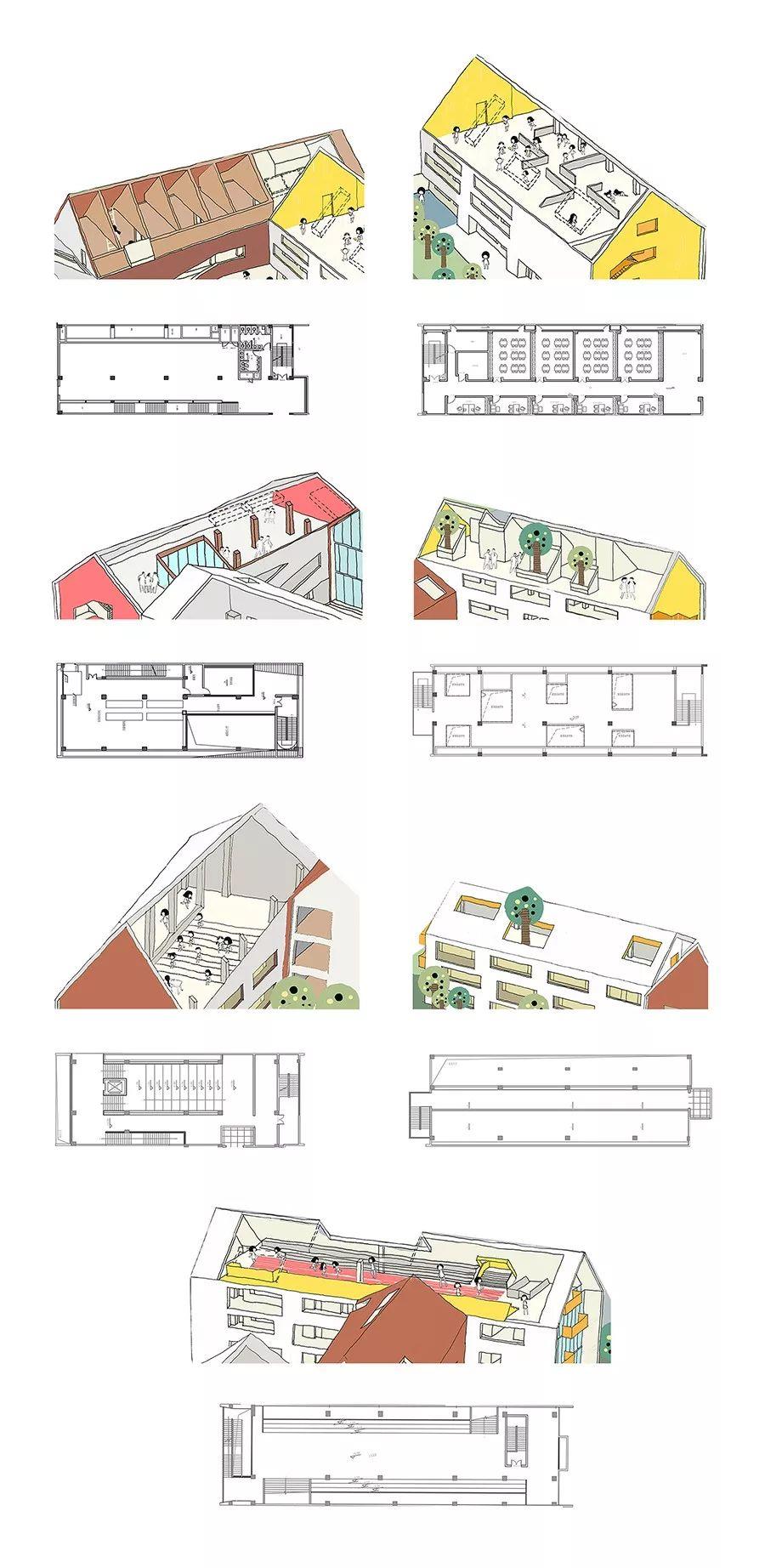 這是一所能滿足27 班小學(xué)和12班幼兒園各項功能需求的學(xué)校。幼兒園、小學(xué)由南到北分布,建筑高度也相應(yīng)地逐漸變高,以滿足不同年齡段學(xué)生的活動和不同身體尺度對空間的需求,學(xué)生對于校園環(huán)境的感受也更加親切。同時,富于變化的小房子打破了城市僵硬的建筑排布,豐富了建筑天際線變化。
