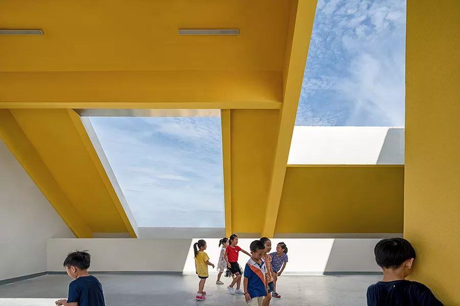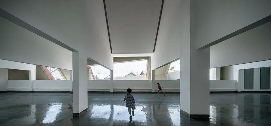 為了給孩子們提供更多的趣味活動空間,設(shè)計師采用雙坡屋頂形式的建筑體量,根據(jù)每個屋頂空間的特質(zhì),結(jié)合相應(yīng)的學(xué)生群體特點對其進行空間設(shè)計和活動規(guī)劃,創(chuàng)造了許多的屋頂活動空間,可以讓孩子們自由的探索和創(chuàng)意使用,如躲貓貓的游戲場、認識植物的種植園,聽老師講故事的小劇場,安靜讀書的閱覽室、肆意奔跑的跑道等等。