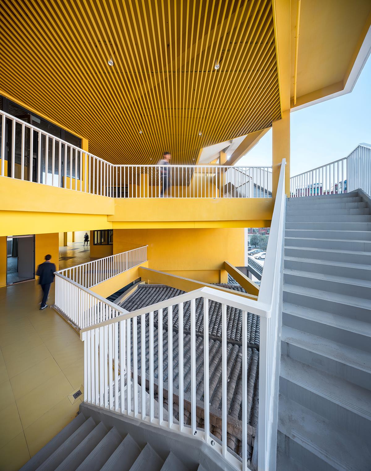 校園首層裙房的折面屋頂鋪滿了小青瓦,是中國傳統(tǒng)建筑中最常見的一種材料之一。從上層建筑向外眺望就可以看到,瓦片不僅起到建筑屋面保溫防水的作用,還為整個校園帶來了一份優(yōu)雅和淡然。校園內(nèi)的場地東北側(cè)和西南側(cè)的標(biāo)高有著3-4米的高差,屋頂?shù)恼勖媲擅畹慕Y(jié)合了地形,在高差最明顯的地方屋頂與地面相連,使人能夠直接漫步到裙房的屋頂,感受到層層疊疊的瓦片所帶來的時間沉淀后的痕跡和感染力。材料和形式上的創(chuàng)新設(shè)計和面向未來的處理手法卻能夠?qū)⑷藥氲奖就粱膫鹘y(tǒng)空間體驗(yàn)。
