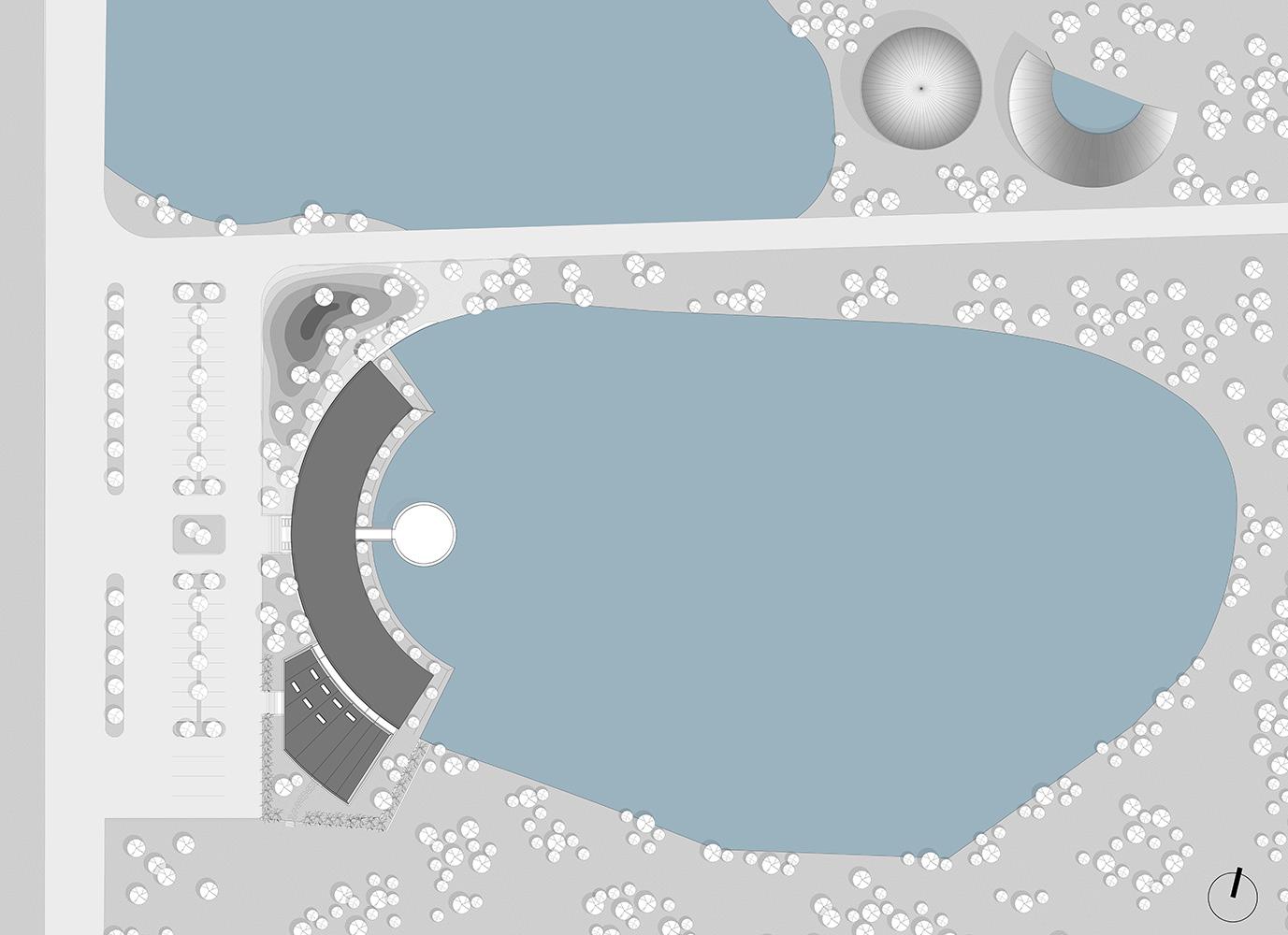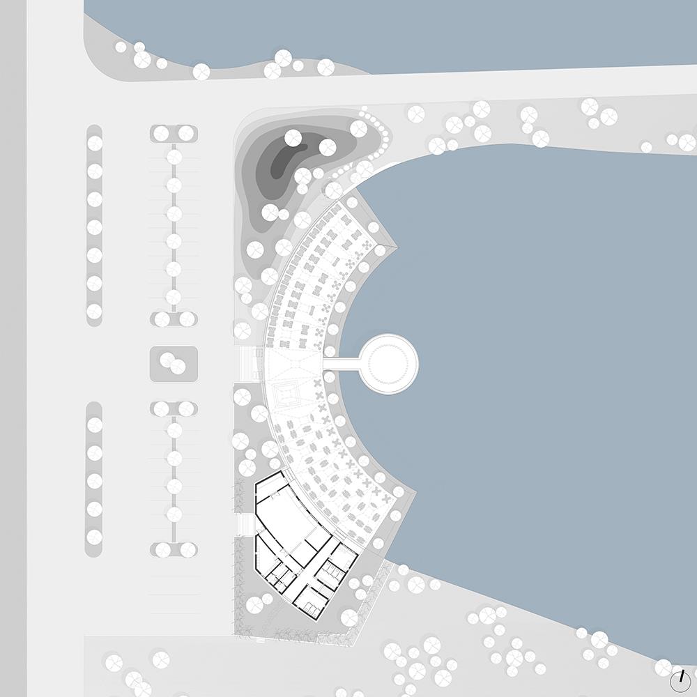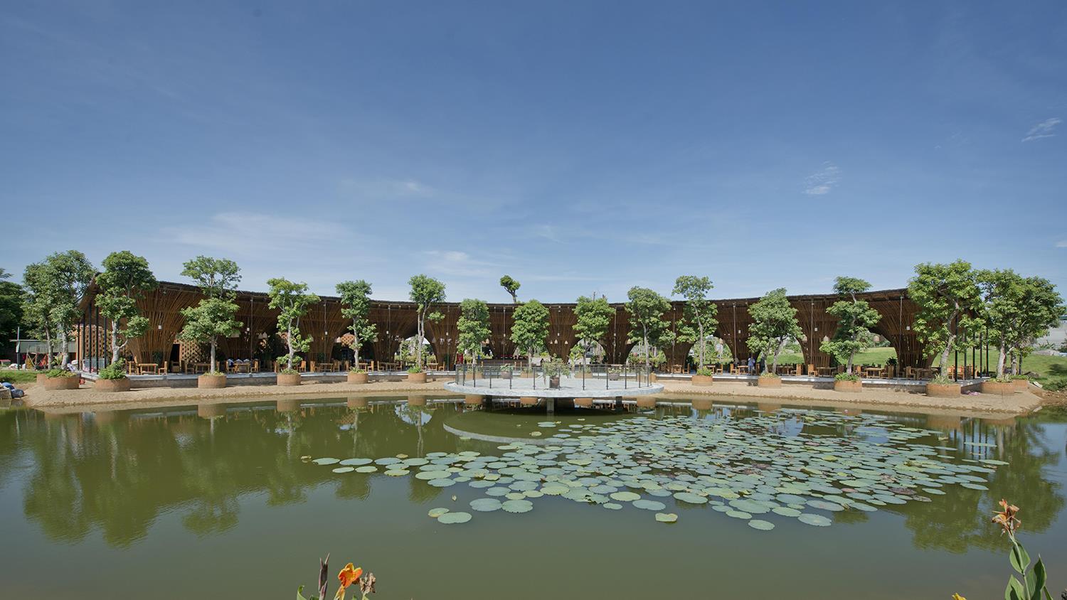 該餐廳就在道路的旁邊。為給客人創(chuàng)造一個(gè)私密的空間,設(shè)計(jì)師通過低于路面的設(shè)計(jì)讓餐廳與喧囂的馬路分隔開來。當(dāng)客人從公路來到餐廳后,就可以坐在用竹子制作的竹棚下面,面對(duì)著一個(gè)天然湖泊。12個(gè)竹編柱子構(gòu)成的竹結(jié)構(gòu)作為屋頂?shù)闹?,形成一個(gè)半室外的用餐環(huán)境?;⌒蔚闹醒胛枧_(tái)用來舉行各種表演活動(dòng),同時(shí)也也給客人帶來一種親密又溫馨的感知。