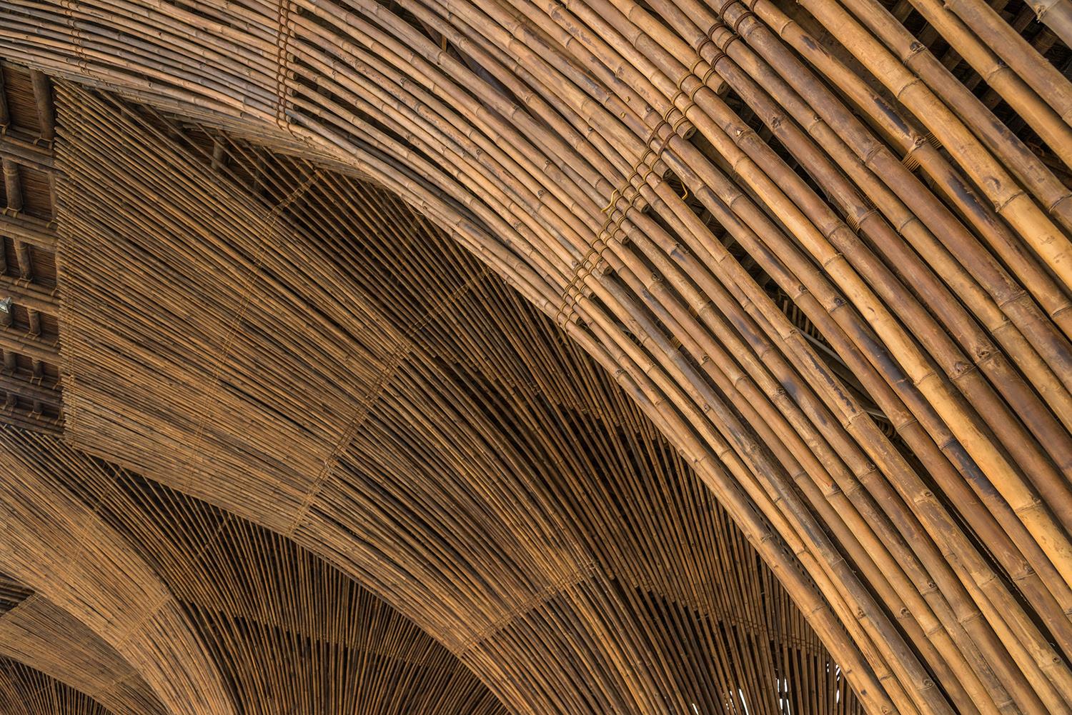 我們使用了Tam Vong竹和Luong竹(兩種不同的竹子)制作了竹編柱子。它們每種都有各自的特點(diǎn),而這些特性對(duì)建筑結(jié)構(gòu)是至關(guān)重要的。竹子在越南已被廣泛使用,它能夠制作出高質(zhì)量的產(chǎn)品,并且是一種具有耐久性的材料。利用它的自然特性就能夠建造出一個(gè)具有可持續(xù)發(fā)展性的建筑。