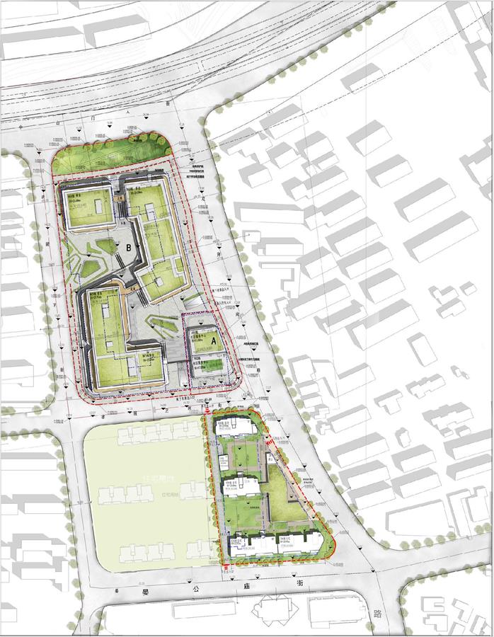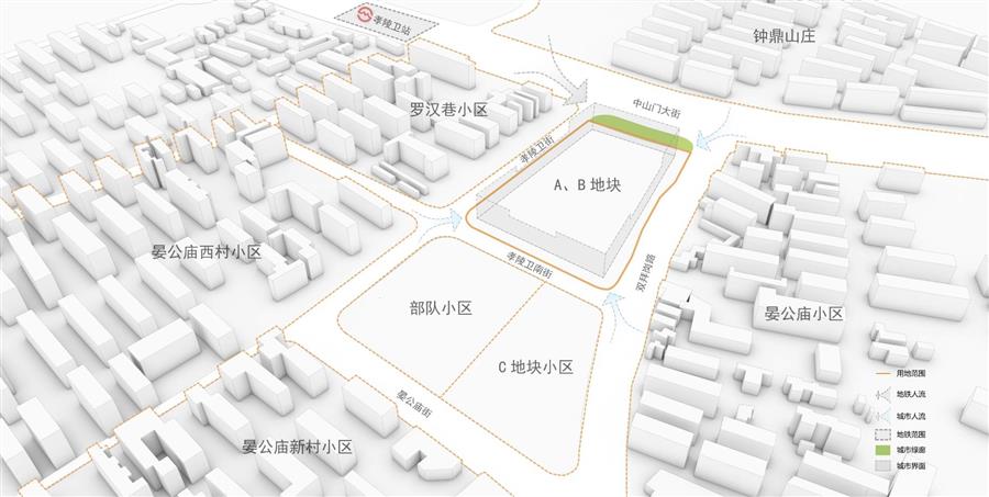 根據(jù)場(chǎng)地周邊狀況,對(duì)現(xiàn)狀條件整合評(píng)估,結(jié)合“動(dòng)”和“靜”交通流線分析,將距離地鐵站及城市主干路最近,交通便利的AB地塊,劃分為商業(yè)、辦公以及城市相關(guān)設(shè)施為一身的綜合體,形成良好的城市界面提升區(qū)域形象。次干路環(huán)繞的相對(duì)安靜、景觀較佳的C地塊用于住宅和社區(qū)商業(yè)中心,提供宜居的生活活動(dòng)區(qū)。