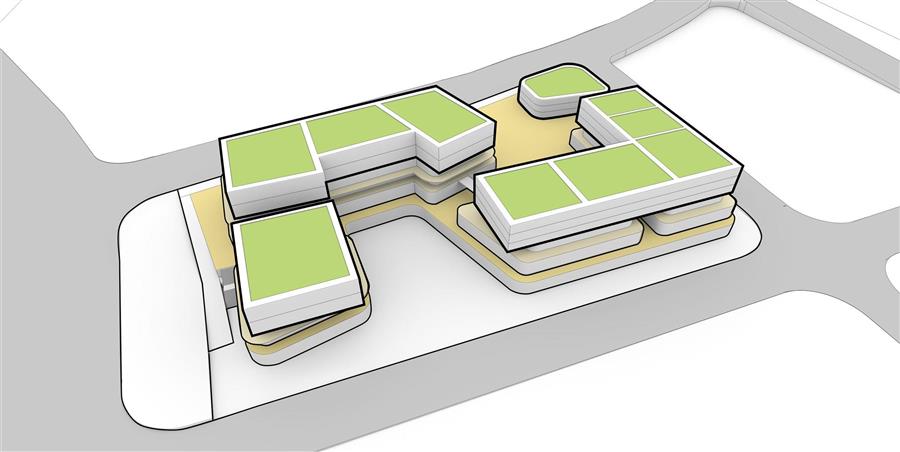 C地塊的住宅和商業(yè),建立宜居“黃金兩公里磁場(chǎng)”社區(qū)定位,形成功能全、景觀滿的社區(qū)環(huán)境。以最大化樓間距的宜居條件為原則,沿南北向布置三排住宅,形成景觀雙庭院。在斜邊布置開放式的社區(qū)服務(wù)綜合體,為社區(qū)居民提供生活和活動(dòng)需求,形成兩公里內(nèi)的黃金生活圈。