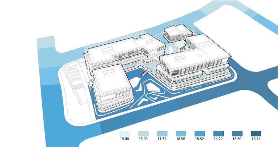 沿街布置的社區(qū)服務(wù)綜合體,呈曲線建筑形態(tài),舒展的線條與道路線鏈接,與城市空間相互滲透。并圍合曲線邊界的小型社交廣場(chǎng),為居民的活動(dòng)提供緩沖地帶,減輕場(chǎng)地的局促感。場(chǎng)地南北向存在4米高差,設(shè)計(jì)利用這個(gè)基地特點(diǎn),打造多首層體驗(yàn)空間,增加城市公共空間和商業(yè)界面,同時(shí)設(shè)計(jì)多個(gè)室外大臺(tái)階,使三層的商業(yè)空間也到激活。
