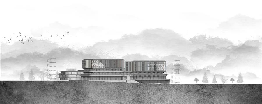 在色彩與材料的選擇上,采用分段式立面設(shè)計(jì),在不同高差對(duì)城市界面做出不同的回應(yīng),底層采用曲線造型,包裹感和時(shí)尚感并存引流人群;上部分采用現(xiàn)代化直角立面,有利于空間的靈活使用,內(nèi)置隱框玻璃幕墻,外設(shè)翻轉(zhuǎn)豎向構(gòu)件,營(yíng)造序列感,適當(dāng)增加傳統(tǒng)元素,呼應(yīng)傳統(tǒng)文脈,同時(shí)配備廣告位、LED等跳躍元素,色彩變幻的燈光效果,使商業(yè)綜合體成為區(qū)域聚集的中心。