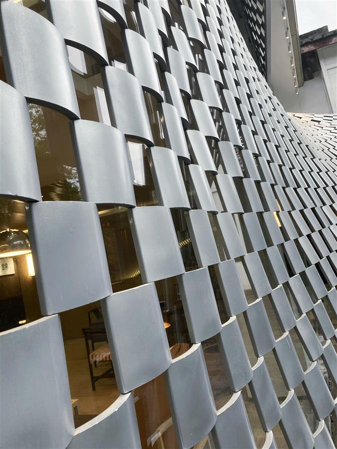 “浮瓦”從原始瓦屋頂開始向整個主立面延伸覆蓋,在空間的內(nèi)與外都能最直接感受到這個新的立面。以瓦為簾,局部輕輕撩起,室內(nèi)外景觀得以相互滲透;由此形成了猶抱琵琶半遮面的立面形象。