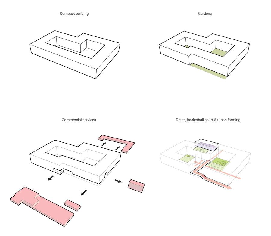 我們被要求在Antonio Vivaldistraat的一側(cè)做一個(gè)入口,并在Boelelaan的角落創(chuàng)造一個(gè)特殊的項(xiàng)目,以刺激該地區(qū)的活力。通過(guò)在戰(zhàn)略位置拆除一些公寓,我們能夠創(chuàng)造出公共、商業(yè)和集體用途的空間。公共和私人功能的混合,輔以兩個(gè)獨(dú)立的戶外空間,每個(gè)空間都有自己的特色,確保了一個(gè)舒適的生活環(huán)境。