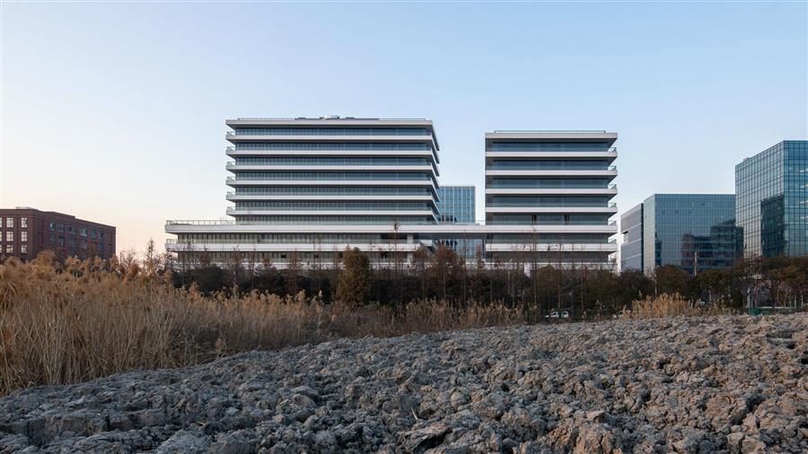 場地西側緊鄰上海外環(huán)高速,南側為城市鐵路。設計希望在高架和鐵路上飛馳而過的時候,進入大眾視野的是一片獨特和優(yōu)雅的園區(qū)建筑,在城市形象上樹立園區(qū)良好的品牌形象。