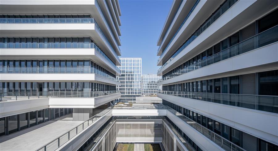 首層架空形成開闊入口及院落,往上再通過廊道和露臺串聯(lián)起不同的建筑體量,裙房頂則成為辦公之余可以享用的大片露臺……