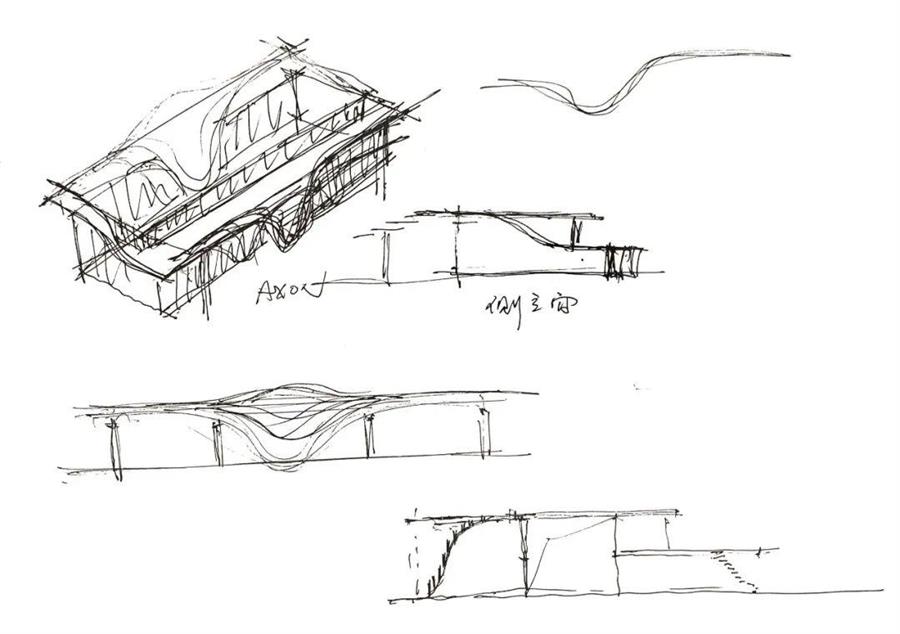 流線型挑檐的主要建造難點(diǎn)來自雨棚造型的雙曲面,設(shè)計(jì)師通過簡(jiǎn)化分割,將雙曲面轉(zhuǎn)化為單曲面,從三維降至二維,既降低了施工難度,又展現(xiàn)出羽翅層疊的美感。