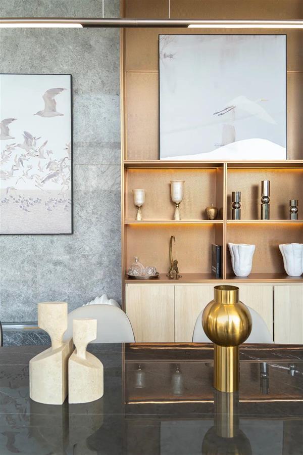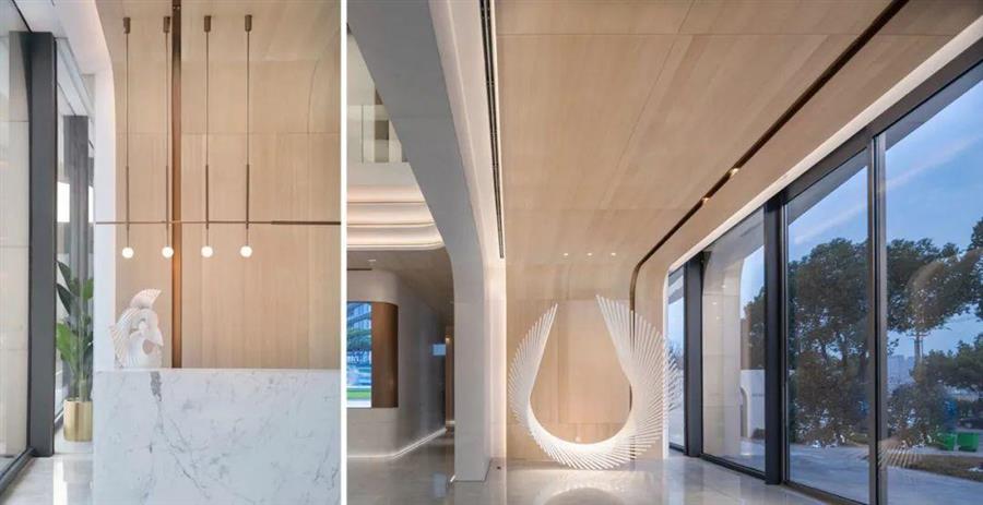 門廳作為主廳的前奏,設(shè)計(jì)師適當(dāng)壓低了空間,并且以白色洞門作為軟性分隔,形成框景。空間兩端,軟裝布置了兩組“鷺”主題的雕塑作品,相和互鳴,埋下伏筆。
