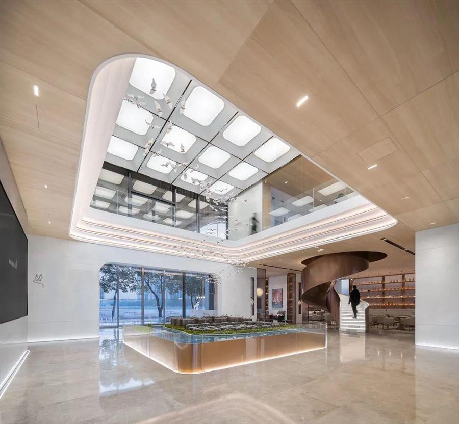 穿過門廳,來到兩層通高的中心展廳,高度的錯(cuò)落轉(zhuǎn)換,收放之間,豁然開朗。以沙盤為核心,圓角矩形蕩漾出通高中庭,內(nèi)收為層疊燈帶,繼續(xù)上浮分形,排列成薄膜頂燈,空間縱向延伸,幾何交互統(tǒng)一。