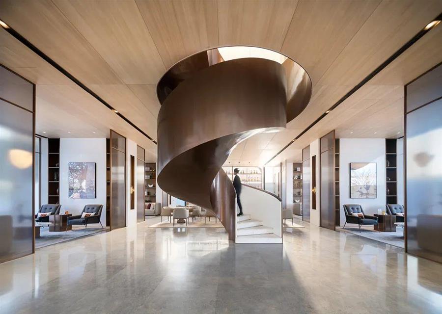 沙盤區(qū)側(cè)面的古銅色旋轉(zhuǎn)樓梯,是重要的視覺元素,指引動(dòng)線從主廳走向洽談區(qū),扭動(dòng)與斷續(xù)中,豐富了空間層次。