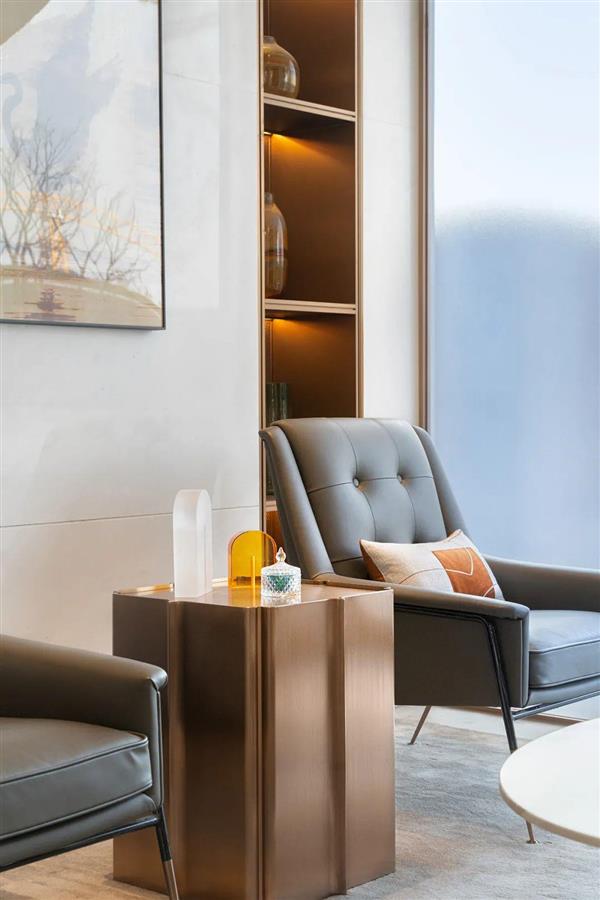 深度洽談區(qū)在白金主色下,輔以橙色桌面擺件,Poltrona Frau的灰色真皮沙發(fā)作為跳色,鋪就簡(jiǎn)約輕奢的質(zhì)感,墻面掛畫選用白鷺主題攝影作品,畫鷺點(diǎn)睛。