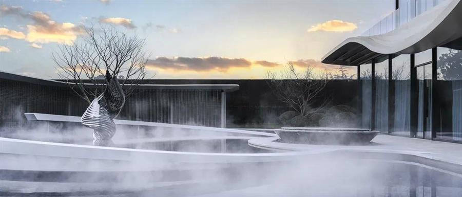 走出生活館,由玖鹿景觀設(shè)計(jì)的中央水景素雅別致:“飄帶”流暢舒緩,仿若白鷺不經(jīng)意間揮灑的浪花,與建筑融為一體。