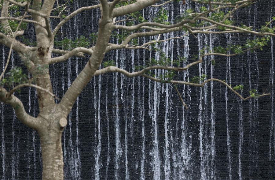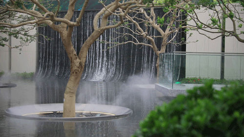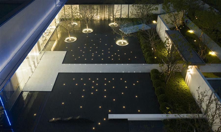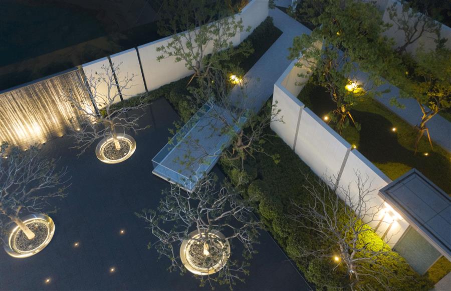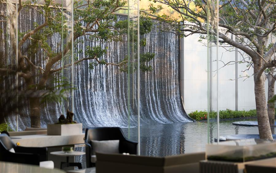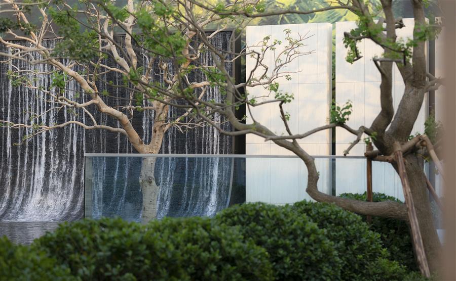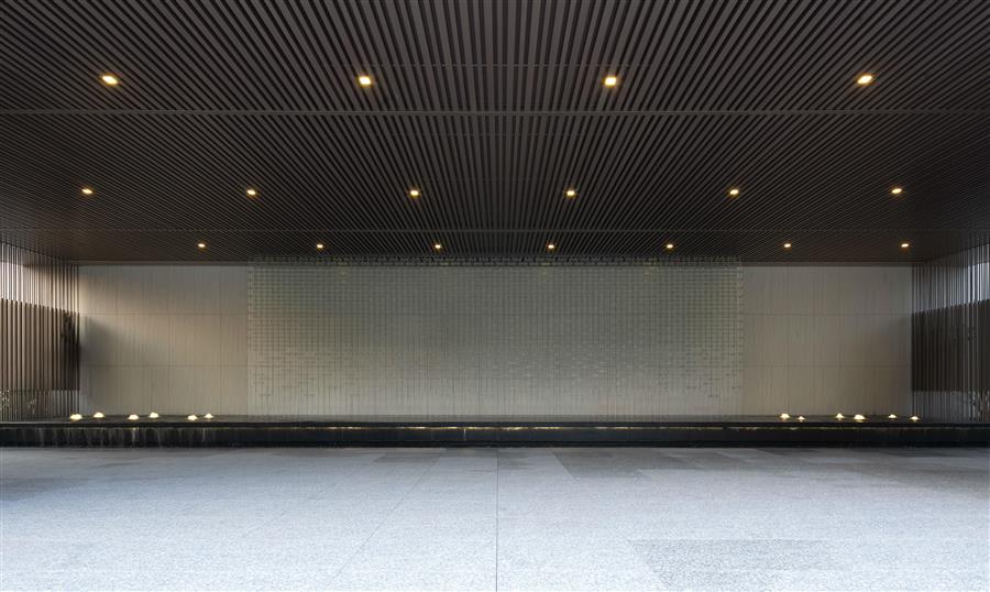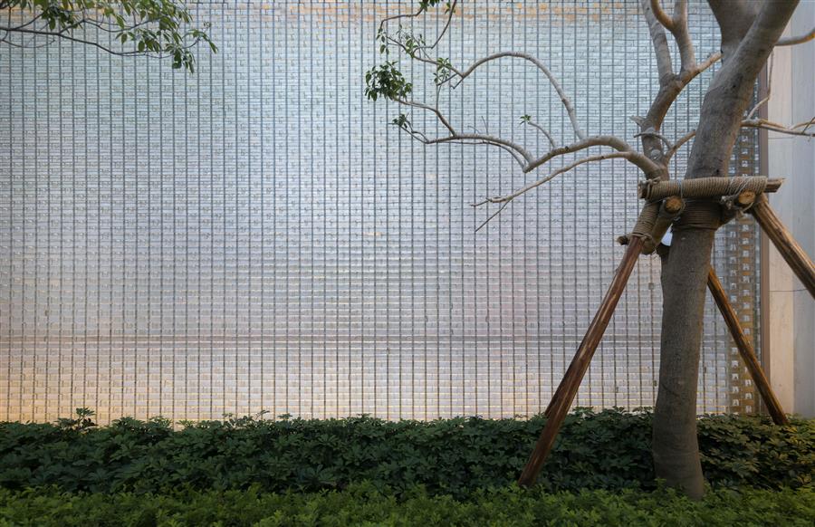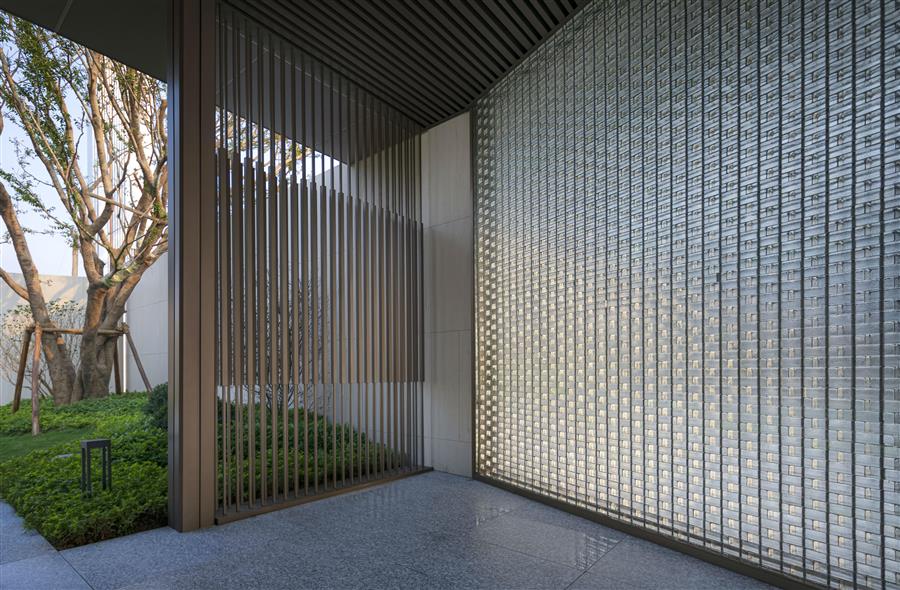 站在內(nèi)庭,身旁空無一物,又被萬物環(huán)抱,與天地同游。側(cè)耳聽,水流淙淙,流水板藏于一隅;有風(fēng)起,水波蕩漾,風(fēng)動幕墻波光粼粼。