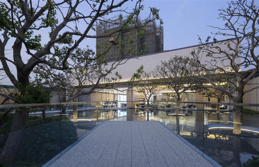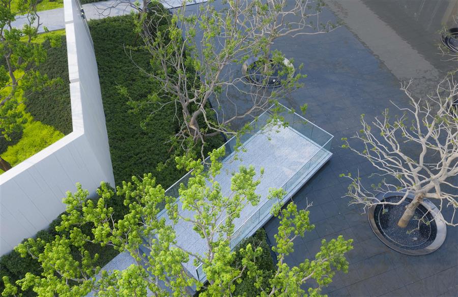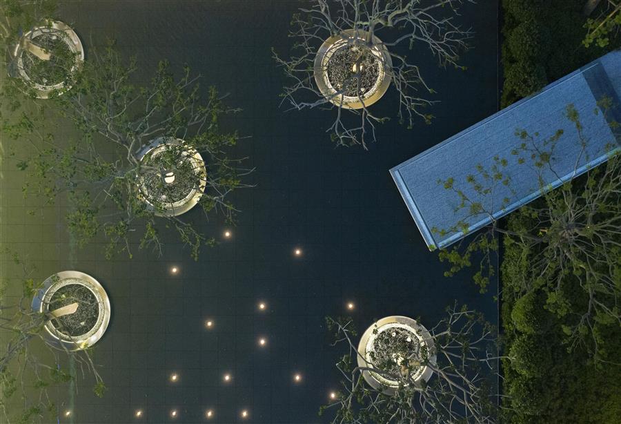 似是無意驚鴻一瞥的遇見,又像華麗樂章跳出的音符,斜向深處的眺臺漂浮在鏡面水景之上,看數(shù)棵鐵冬青優(yōu)雅生長,看云在水里面肆意變幻,清風(fēng)拂面,閑適愜意。