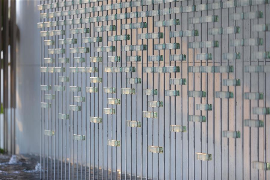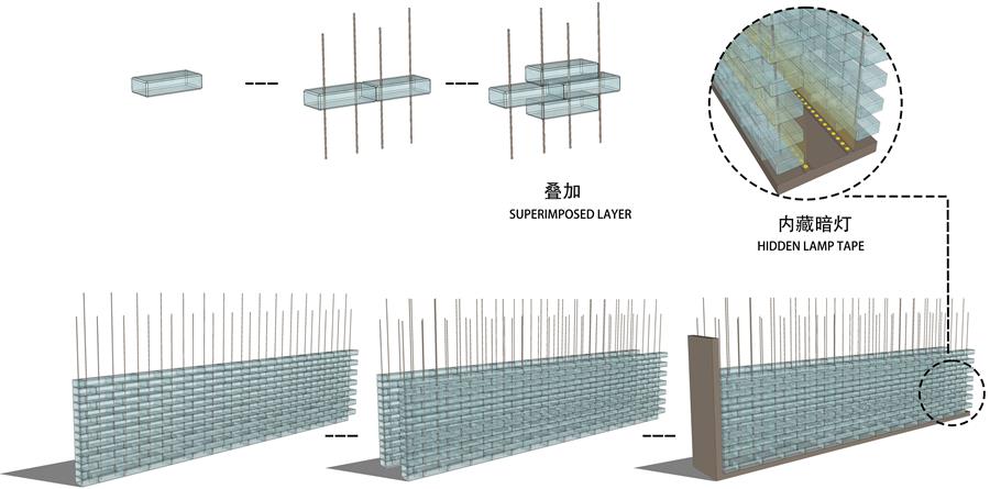 △ 精磨玻璃磚采用200x100x50標(biāo)準(zhǔn)化規(guī)格,以縱向不銹鋼條穿孔固定,不銹鋼封邊處理。為了整體比例和光影效果最佳,現(xiàn)場采用了多種規(guī)格和不同透明度的磚體組合打樣。墻內(nèi)安裝射燈,在夜景中發(fā)揮玻璃磚材質(zhì)的光影魅力。