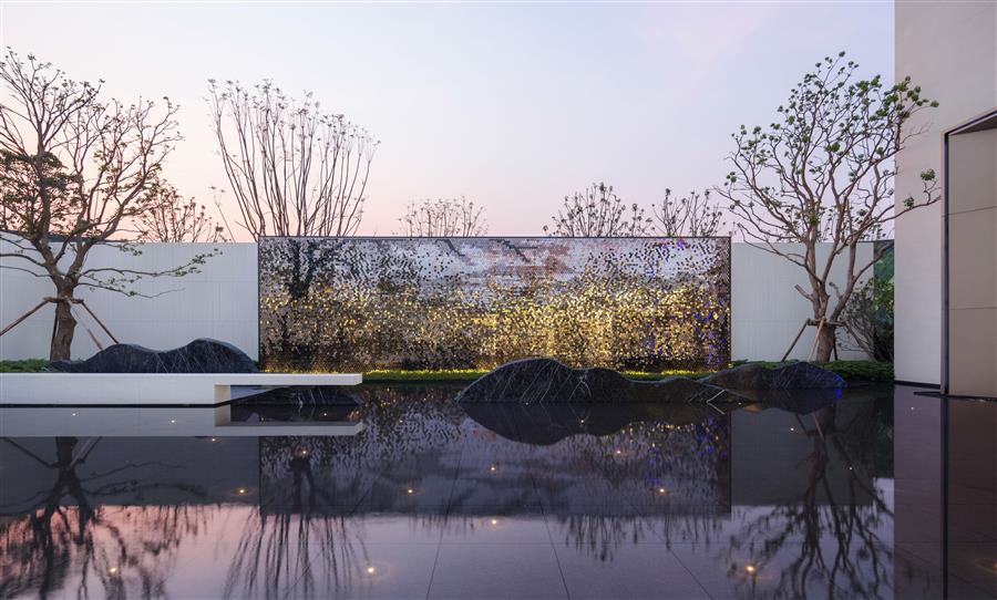 值得一提的是技術(shù)與藝術(shù)完美結(jié)合的風(fēng)動幕墻,以宋代水墨畫為藍(lán)本,借鑒日本狩野派屏障畫的構(gòu)圖特色,這種畫面空間不被邊界局限的構(gòu)圖手法,暗示出空間的擴張性和連續(xù)性。