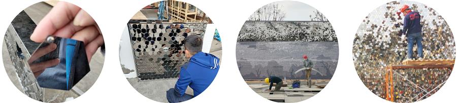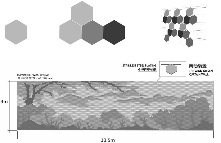 △ 風(fēng)動幕墻整體的造型偏向參數(shù)化設(shè)計,總數(shù)超過15000片的金屬片,規(guī)格統(tǒng)一排列有序。單塊金屬片采用正六邊形電鍍不銹鋼工藝,水平方向不動,垂直方向前后擺動,單片排列留縫隙,配合風(fēng)吹流動效果,整體呈現(xiàn)輕盈靈動的視覺效果和聽覺享受。