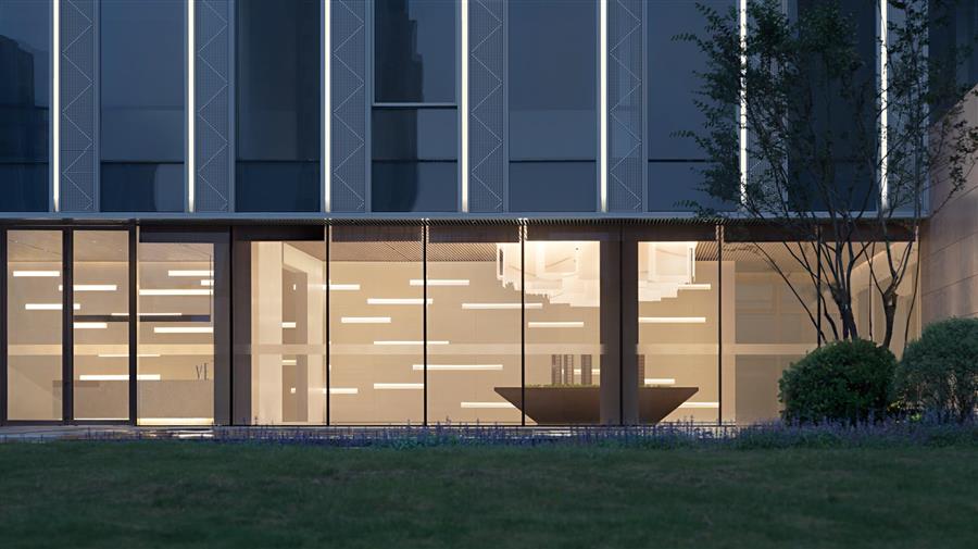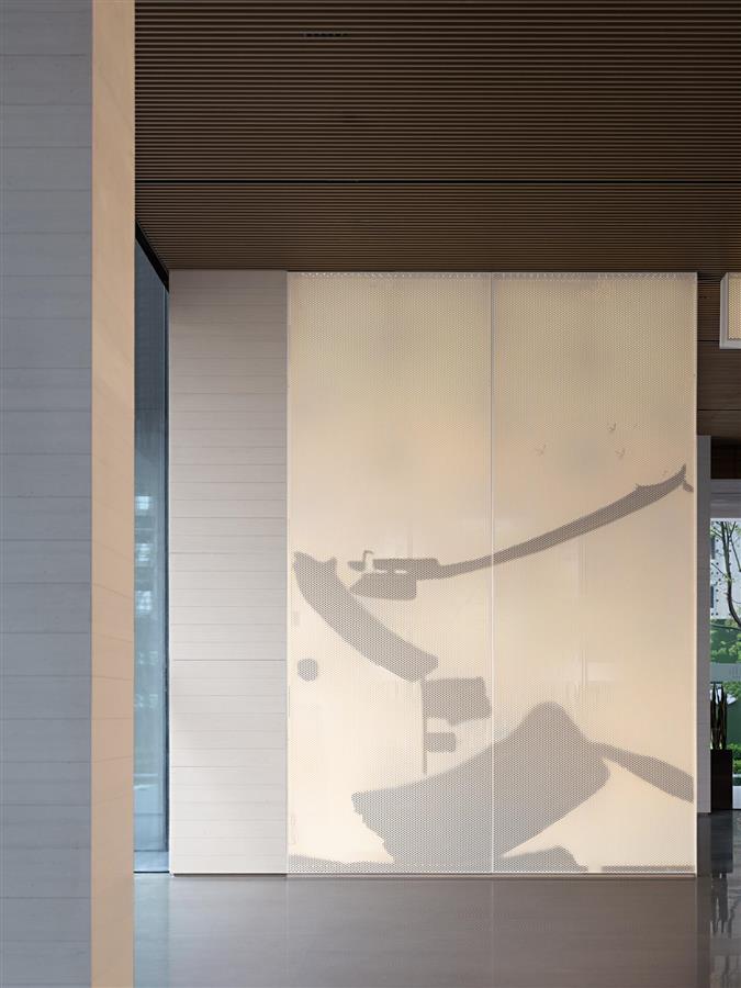 移步深入,即可見沖孔網(wǎng)與藝術(shù)玻璃的雙重疊加,恰似一道門廊,更是一重禮序。以現(xiàn)代手法引入蘇派建筑元素,在朦朧光影的烘托下,仿佛超越了時空的限制,用潤物細(xì)無聲的方式,娓娓道來江南的歷史文化與風(fēng)土人情,喚醒在地記憶。
