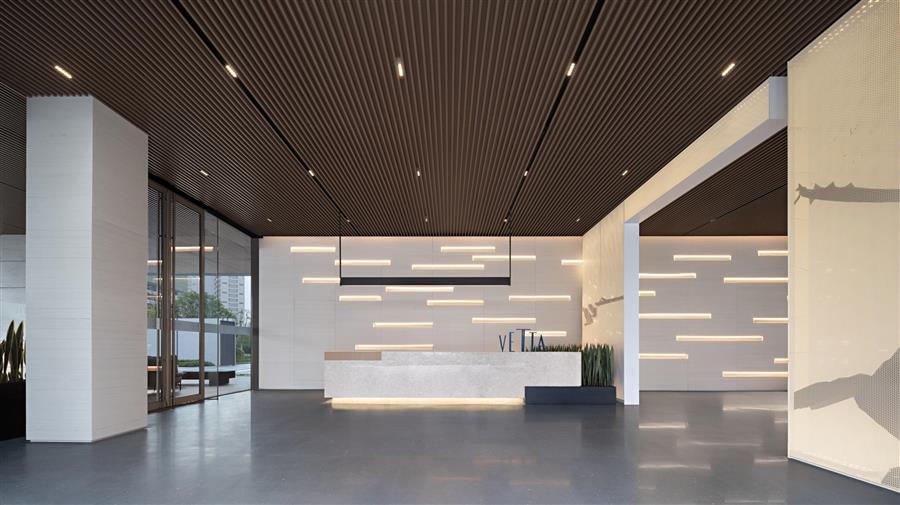 沙盤區(qū)的頂面格柵、立面背景墻皆由接待前廳一體延展而來,形成了縱深的陣列感,無限廣垠,又以顯著的線形指向,呈現(xiàn)出虛實(shí)交替的美學(xué)意境。